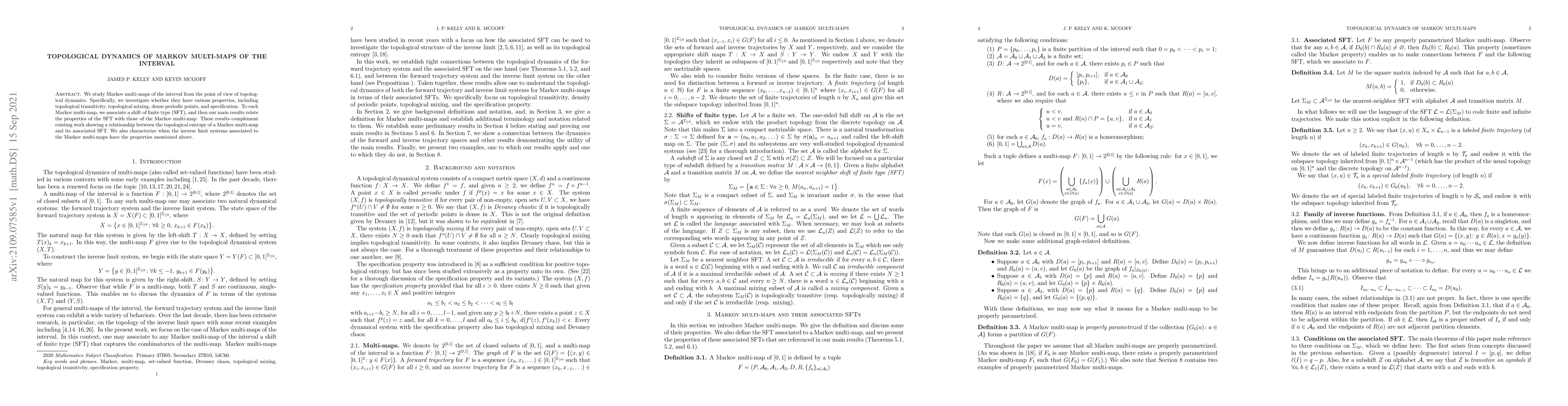 This paper explores the topological dynamics of Markov multi-maps on intervals, linking their properties with those of associated shift of finite type systems. It investigates topological transitivity, mixing, dense periodic points, and specification, and characterizes when inverse limit systems exhibit these properties.
