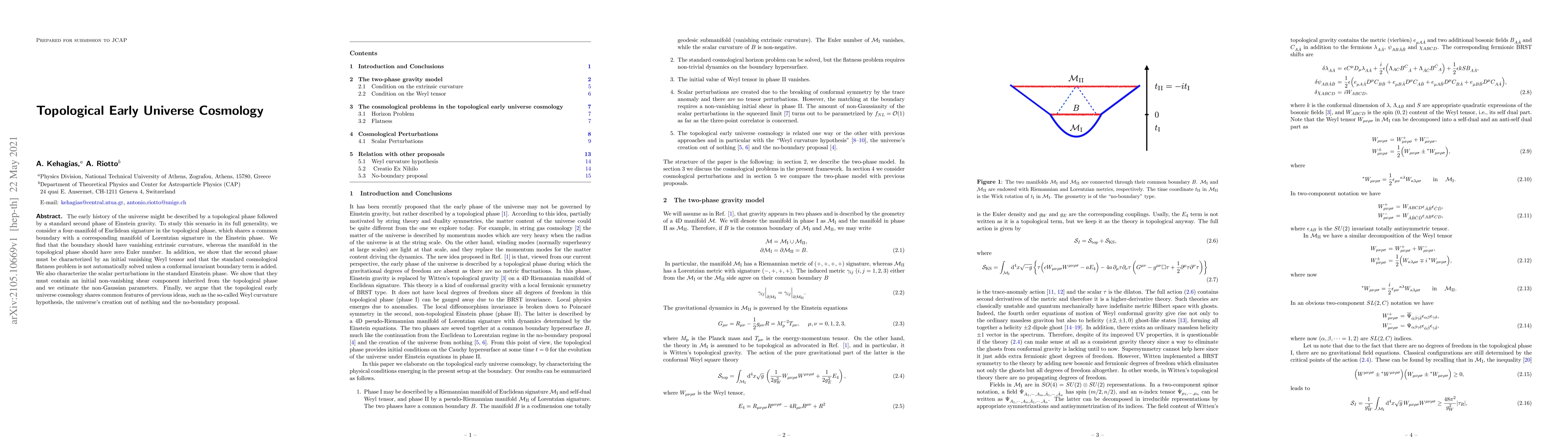 The early history of the universe might be described by a topological phase followed by a standard second phase of Einstein gravity. To study this scenario in its full generality, we consider a four-manifold of Euclidean signature in the topological phase, which shares a common boundary with a corresponding manifold of Lorentzian signature in the Einstein phase. We find that the boundary should have vanishing extrinsic curvature, whereas the manifold in the topological phase should have zero Euler number. In addition, we show that the second phase must be characterized by an initial vanishing Weyl tensor and that the standard cosmological flatness problem is not automatically solved unless a conformal invariant boundary term is added. We also characterize the scalar perturbations in the standard Einstein phase. We show that they must contain an initial non-vanishing shear component inherited from the topological phase and we estimate the non-Gaussian parameters. Finally, we argue that the topological early universe cosmology shares common features of previous ideas, such as the so-called Weyl curvature hypothesis, the universe's creation out of nothing and the no-boundary proposal.
