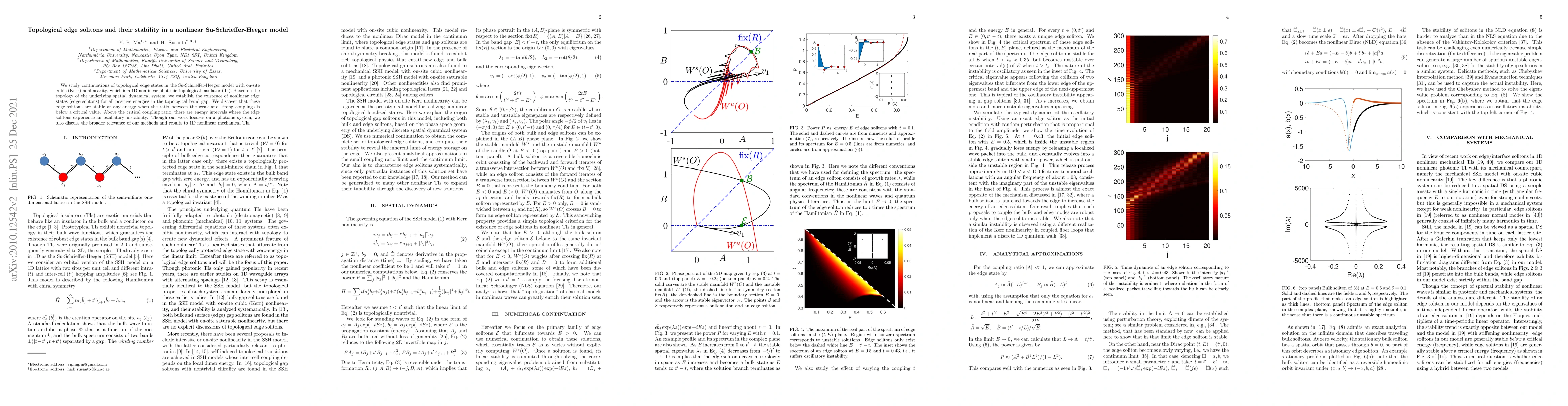 This paper investigates topological edge solitons in a nonlinear Su-Schrieffer-Heeger model, demonstrating their existence and stability for positive energies within the topological band gap. The study reveals that edge solitons remain stable below a critical coupling ratio, but become unstable above it, highlighting the broader applicability of these findings to nonlinear mechanical topological insulators.