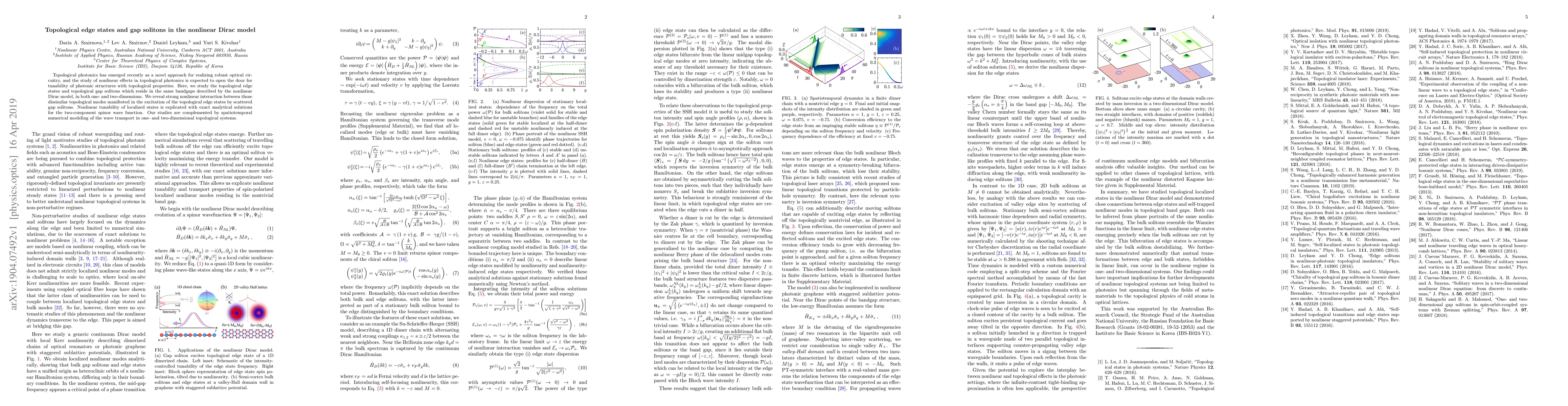 This paper investigates topological edge states and gap solitons in the nonlinear Dirac model, revealing strong nonlinear interactions between these modes. Analytical solutions and numerical simulations demonstrate the tunability of localized states in topological photonic structures.