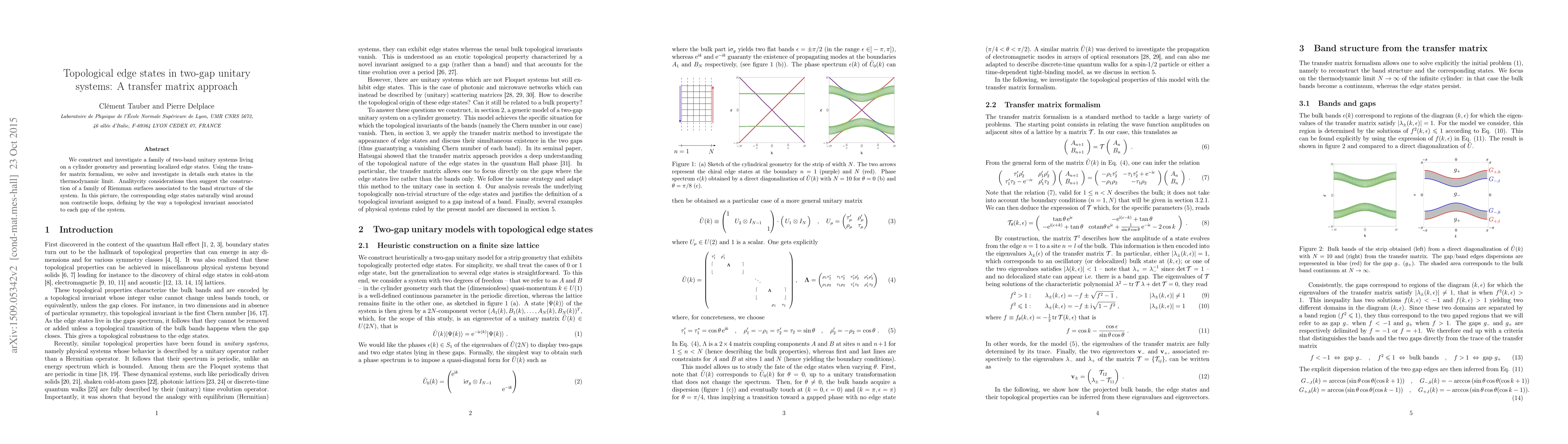 We construct and investigate a family of two-band unitary systems living on a cylinder geometry and presenting localized edge states. Using the transfer matrix formalism, we solve and investigate in details such states in the thermodynamic limit. Analitycity considerations then suggest the construction of a family of Riemman surfaces associated to the band structure of the system. In this picture, the corresponding edge states naturally wind around non contractile loops, defining by the way a topological invariant associated to each gap of the system.