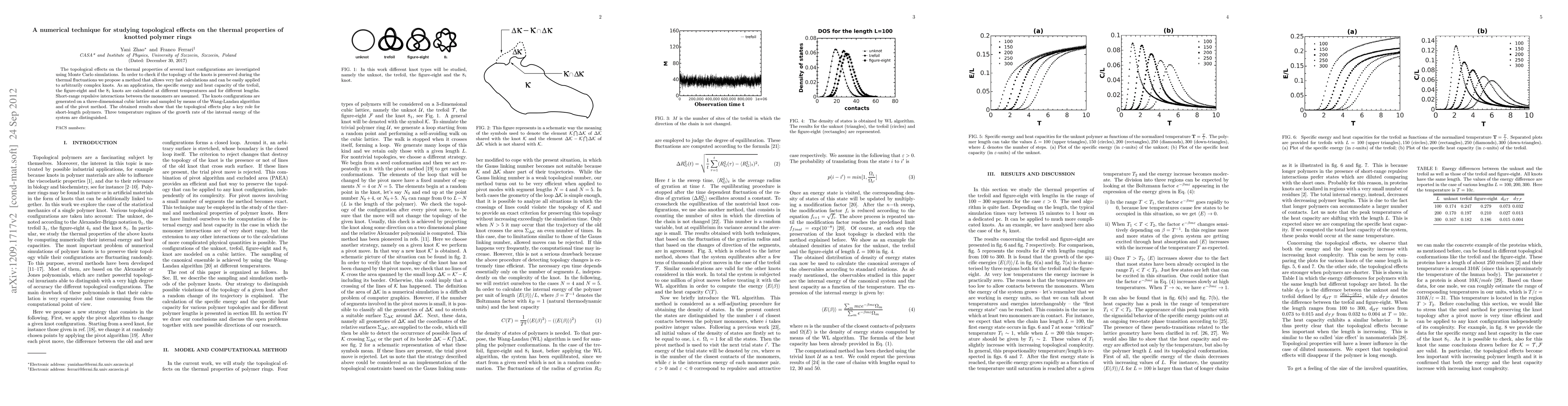The topological effects on the thermal properties of several knot configurations are investigated using Monte Carlo simulations. In order to check if the topology of the knots is preserved during the thermal fluctuations we propose a method that allows very fast calculations and can be easily applied to arbitrarily complex knots. As an application, the specific energy and heat capacity of the trefoil, the figure-eight and the $8_1$ knots are calculated at different temperatures and for different lengths. Short-range repulsive interactions between the monomers are assumed. The knots configurations are generated on a three-dimensional cubic lattice and sampled by means of the Wang-Landau algorithm and of the pivot method. The obtained results show that the topological effects play a key role for short-length polymers. Three temperature regimes of the growth rate of the internal energy of the system are distinguished.