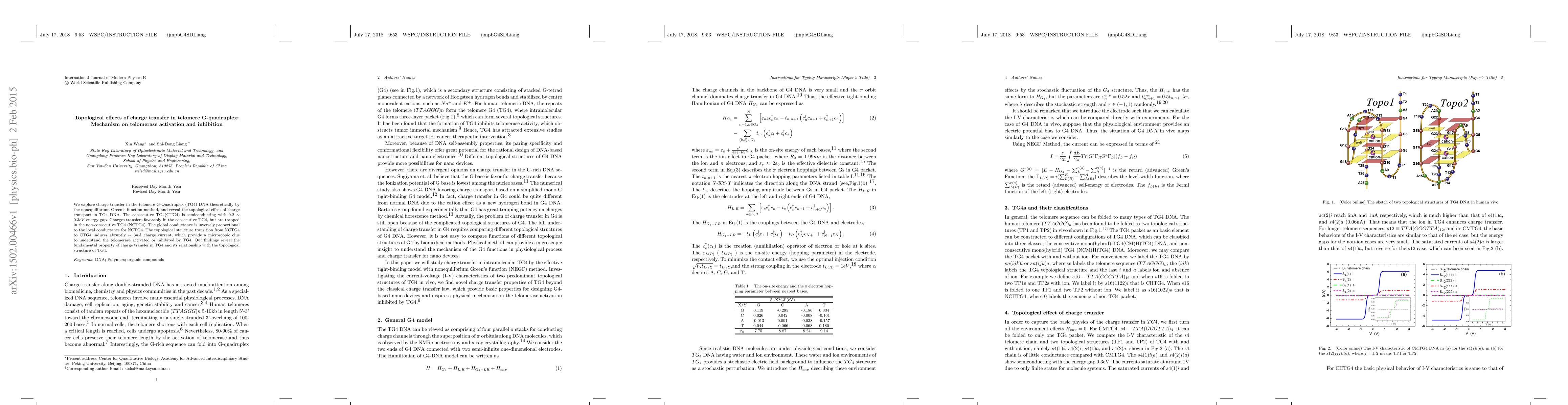 We explore charge transfer in the telomere G-Quadruplex (TG4) DNA theoretically by the nonequilibrium Green's function method, and reveal the topological effect of charge transport in TG4 DNA. The consecutive TG4(CTG4) is semiconducting with 0.2 ~ 0.3eV energy gap. Charges transfers favorably in the consecutive TG4, but are trapped in the non-consecutive TG4 (NCTG4). The global conductance is inversely proportional to the local conductance for NCTG4. The topological structure transition from NCTG4 to CTG4 induces abruptly ~ 3nA charge current, which provide a microscopic clue to understand the telomerase activated or inhibited by TG4. Our findings reveal the fundamental property of charge transfer in TG4 and its relationship with the topological structure of TG4.