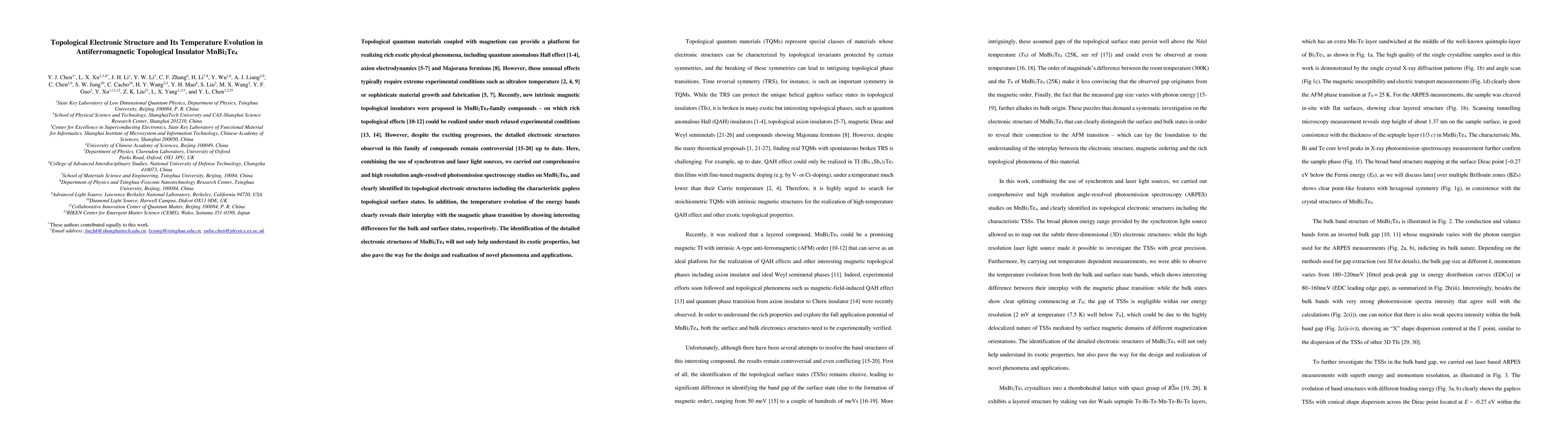 This paper identifies the topological electronic structures in MnBi2Te4 using high-resolution angle-resolved photoemission spectroscopy, revealing gapless topological surface states and their temperature-dependent evolution linked to magnetic phase transitions. The findings clarify the material's potential for novel quantum phenomena under more accessible experimental conditions.