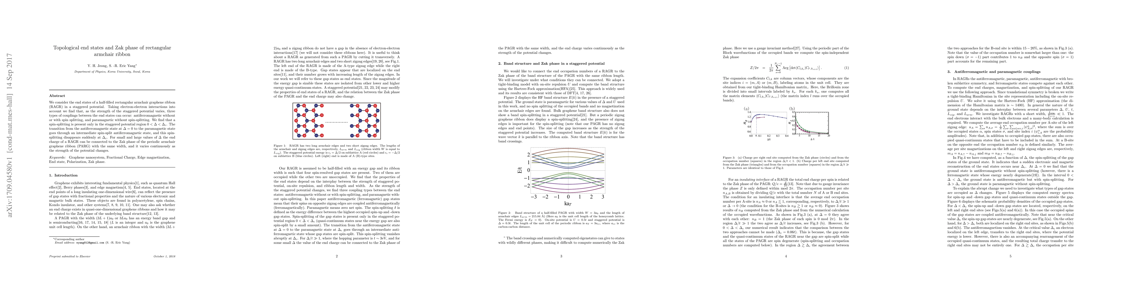 We consider the end states of a half-filled rectangular armchair graphene ribbon (RAGR) in a staggered potential. Taking electron-electron interactions into account we find that, as the strength of the staggered potential varies, three types of couplings between the end states can occur: antiferromagnetic without or with spin splitting, and paramagnetic without spin-splitting. We find that a spin-splitting is present only in the staggered potential region $0<\Delta<\Delta_c$. The transition from the antiferromagnetic state at $\Delta=0$ to the paramagnetic state goes through an intermediate spin-split antiferromagnetic state, and this spin-splitting disappears suddenly at $\Delta_c$. For small and large values of $\Delta$ the end charge of a RAGR can be connected to the Zak phase of the periodic armchair graphene ribbon (PARG) with the same width, and it varies continuously as the strength of the potential changes.