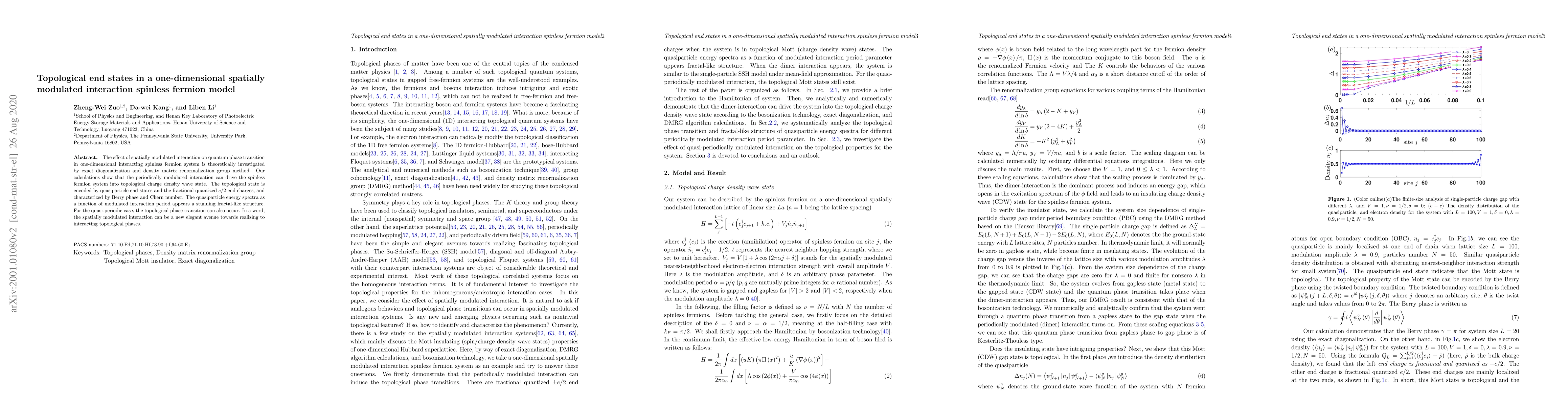 This paper investigates the impact of spatially modulated interactions on quantum phase transitions in one-dimensional spinless fermion systems, revealing that such interactions can drive the system into a topological charge density wave state characterized by quasiparticle end states and fractional charges. The study highlights the fractal-like structure of the energy spectra and suggests that modulated interactions provide a straightforward route to interacting topological phases.