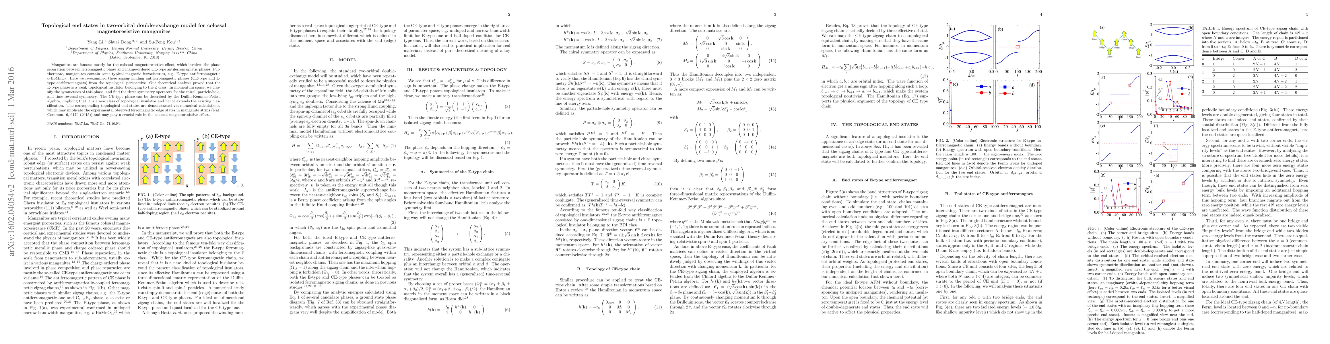 This paper investigates topological end states in the two-orbital double-exchange model for colossal magnetoresistive manganites, revealing that the E-type antiferromagnetic phase is a weak topological insulator, while the CE-type antiferromagnetic phase represents a new class of topological insulator. The study provides a theoretical classification and demonstrates topological end states through numerical calculations.