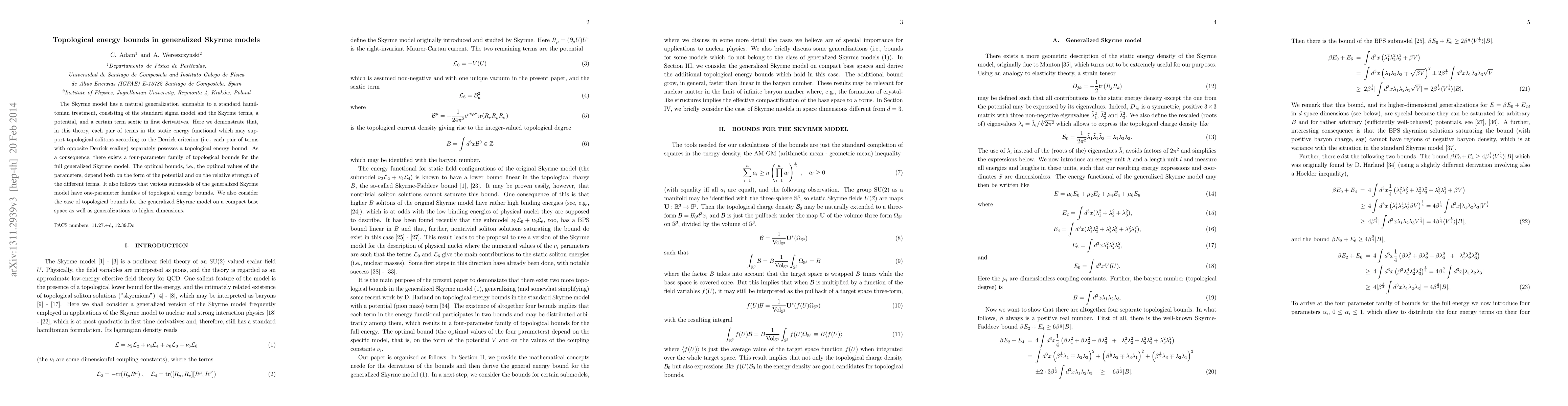 This paper investigates topological energy bounds in generalized Skyrme models, demonstrating that each pair of terms supporting topological solitons has its own topological energy bound. The study reveals a four-parameter family of such bounds for the full model, with optimal values dependent on the potential and term strengths.