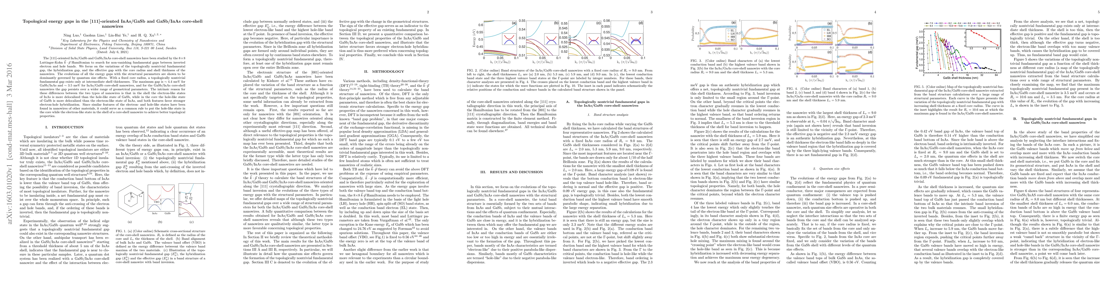 The [111]-oriented InAs/GaSb and GaSb/InAs core-shell nanowires have been studied by the $8\times 8$ Luttinger-Kohn $\vec{k}\cdot\vec{p}$ Hamiltonian to search for non-vanishing fundamental gaps between inverted electron and hole bands. We focus on the variations of the topologically nontrivial fundamental gap, the hybridization gap, and the effective gap with the core radius and shell thickness of the nanowires. The evolutions of all the energy gaps with the structural parameters are shown to be dominantly governed by quantum size effects. With a fixed core radius, a topologically nontrivial fundamental gap exists only at intermediate shell thicknesses. The maximum gap is $\sim 4.4$ meV for GaSb/InAs and $\sim 3.5$ meV for InAs/GaSb core-shell nanowires, and for the GaSb/InAs core-shell nanowires the gap persists over a wider range of geometrical parameters. The intrinsic reason for these differences between the two types of nanowires is that in the shell the electron-like states of InAs is more delocalized than the hole-like state of GaSb, while in the core the hole-like state of GaSb is more delocalized than the electron-like state of InAs, and both features favor stronger electron-hole hybridization. Since similar features of the electron- and hole-like states have been found in nanowires of other materials, it could serve as a common rule to put the hole-like state in the core while the electron-like state in the shell of a core-shell nanowire to achieve better topological properties.