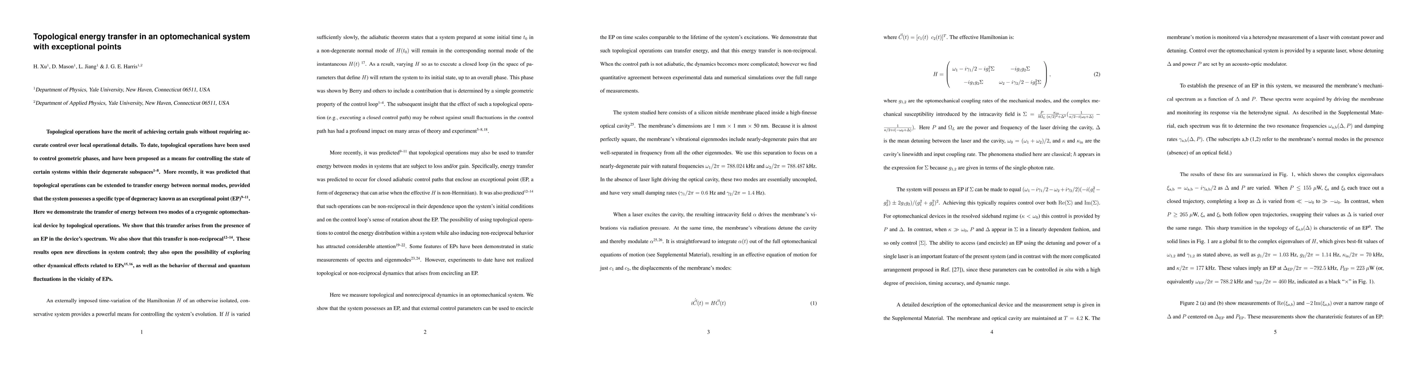 Researchers demonstrate energy transfer between modes in a cryogenic optomechanical device using topological operations, which rely on an exceptional point in the system's spectrum.
