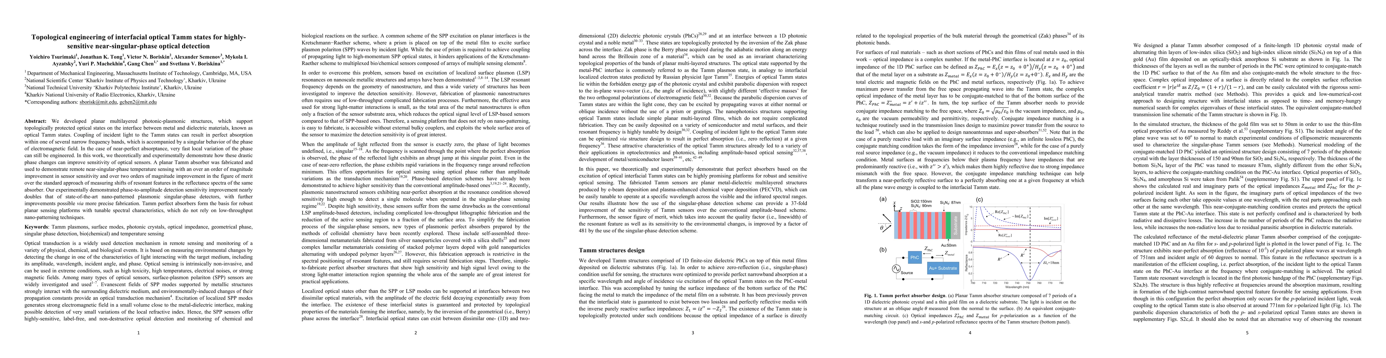 This paper develops planar multilayered photonic-plasmonic structures supporting topologically protected optical Tamm states, demonstrating significant sensitivity improvements in optical sensors through near-singular-phase detection, achieving over an order of magnitude better sensitivity than traditional methods.