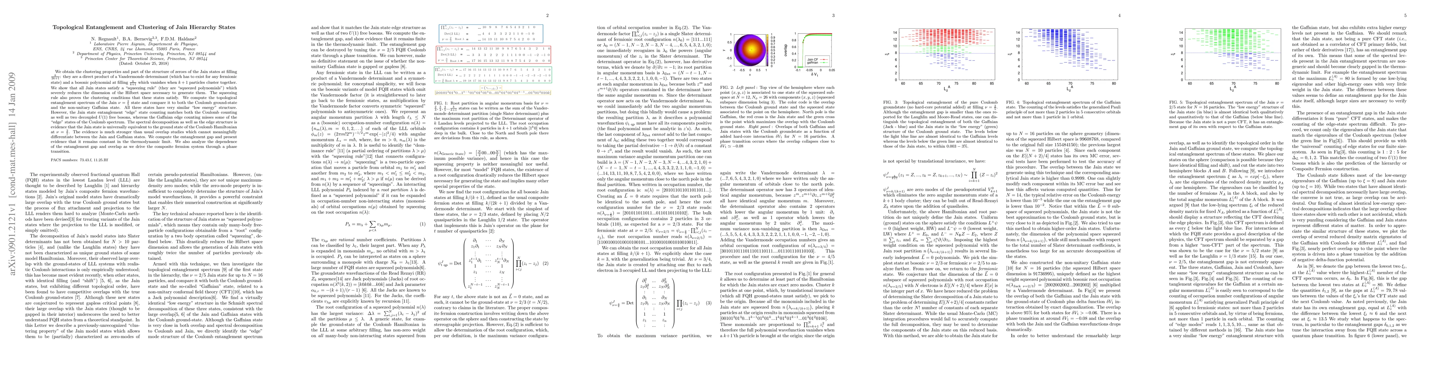 We obtain the clustering properties and part of the structure of zeroes of the Jain states at filling $\frac{k}{2k+1}$: they are a direct product of a Vandermonde determinant (which has to exist for any fermionic state) and a bosonic polynomial at filling $\frac{k}{k+1}$ which vanishes when $k+1$ particles cluster together. We show that all Jain states satisfy a "squeezing rule" (they are "squeezed polynomials") which severely reduces the dimension of the Hilbert space necessary to generate them. The squeezing rule also proves the clustering conditions that these states satisfy. We compute the topological entanglement spectrum of the Jain $\nu={2/5}$ state and compare it to both the Coulomb ground-state and the non-unitary Gaffnian state. All three states have very similar "low energy" structure. However, the Jain state entanglement "edge" state counting matches both the Coulomb counting as well as two decoupled U(1) free bosons, whereas the Gaffnian edge counting misses some of the "edge" states of the Coulomb spectrum. The spectral decomposition as well as the edge structure is evidence that the Jain state is universally equivalent to the ground state of the Coulomb Hamiltonian at $\nu={2/5}$. The evidence is much stronger than usual overlap studies which cannot meaningfully differentiate between the Jain and Gaffnian states. We compute the entanglement gap and present evidence that it remains constant in the thermodynamic limit. We also analyze the dependence of the entanglement gap and overlap as we drive the composite fermion system through a phase transition.