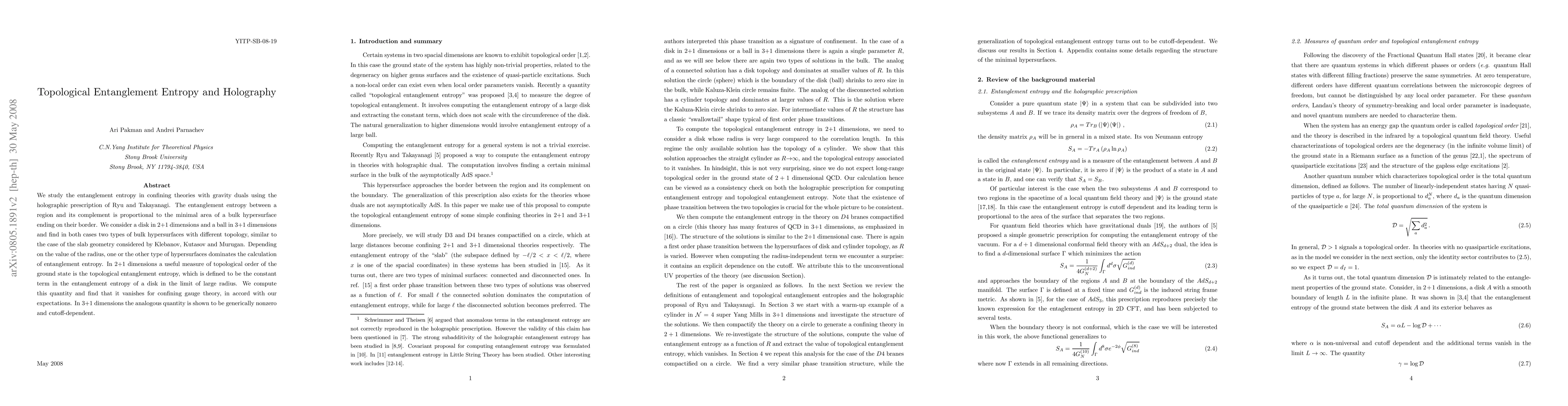 This paper investigates entanglement entropy in confining theories with gravity duals using the Ryu-Takayanagi prescription. It finds that entanglement entropy in 2+1 and 3+1 dimensions depends on the topology of bulk hypersurfaces, and while the topological entanglement entropy vanishes in 2+1 dimensions for confining gauge theory, it is nonzero and cutoff-dependent in 3+1 dimensions.