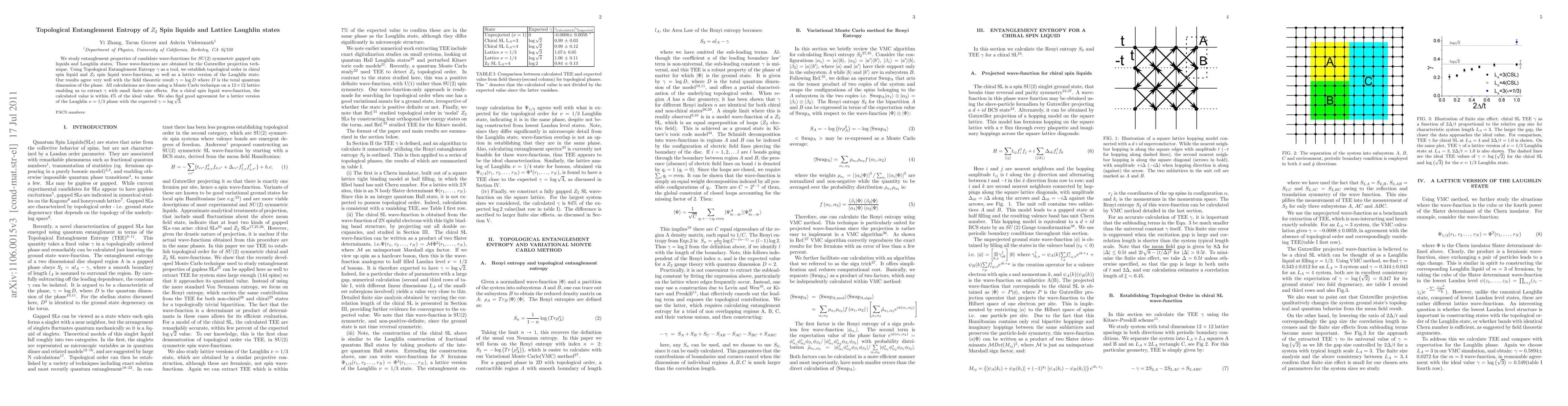 We study entanglement properties of candidate wave-functions for SU(2) symmetric gapped spin liquids and Laughlin states. These wave-functions are obtained by the Gutzwiller projection technique. Using Topological Entanglement Entropy \gamma\ as a tool, we establish topological order in chiral spin liquid and Z2 spin liquid wave-functions, as well as a lattice version of the Laughlin state. Our results agree very well with the field theoretic result \gamma =log D where D is the total quantum dimension of the phase. All calculations are done using a Monte Carlo technique on a 12 times 12 lattice enabling us to extract \gamma\ with small finite size effects. For a chiral spin liquid wave-function, the calculated value is within 4% of the ideal value. We also find good agreement for a lattice version of the Laughlin \nu =1/3 phase with the expected \gamma=log \sqrt{3}.