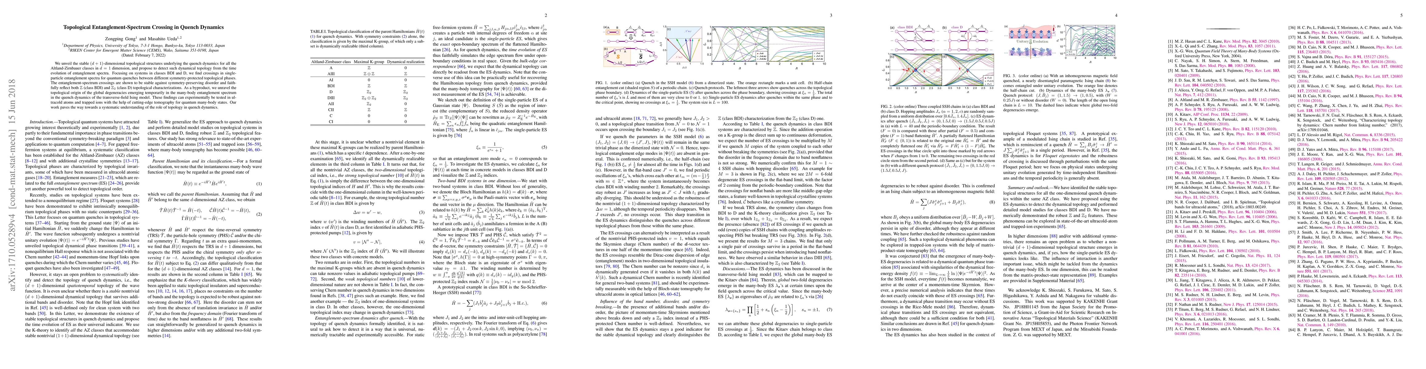 This paper explores the topological structures in quench dynamics across different symmetry-protected topological phases, demonstrating stable entanglement-spectrum crossings that reflect $\mathbb{Z}$ and $\mathbb{Z}_2$ topological characterizations. These findings can be experimentally tested using ultracold atoms and trapped ions.