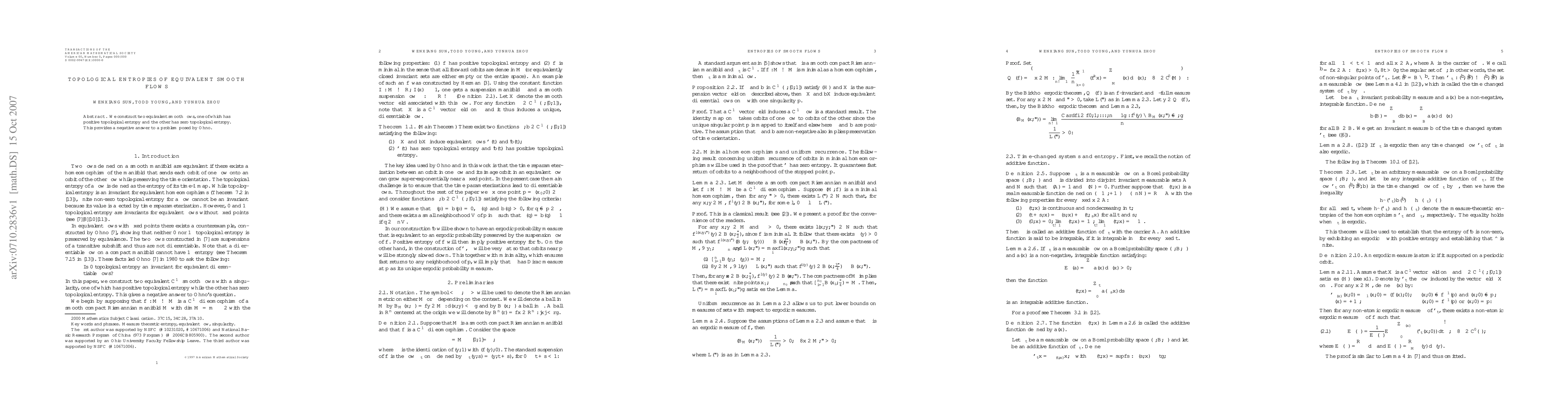 This paper investigates the topological entropy of equivalent smooth flows, demonstrating that 0 topological entropy is not an invariant for equivalent differentiable flows by constructing two such flows with differing topological entropy values. This resolves Ohno's 1980 question in the negative for the class of $C^\infty$ smooth flows.