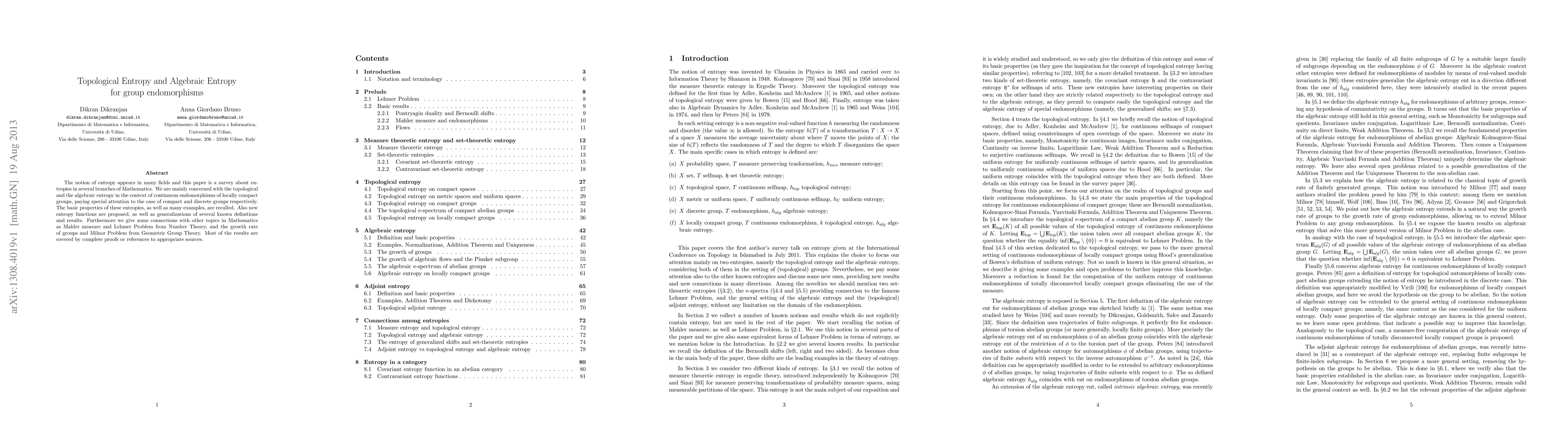 The notion of entropy appears in many fields and this paper is a survey about entropies in several branches of Mathematics. We are mainly concerned with the topological and the algebraic entropy in the context of continuous endomorphisms of locally compact groups, paying special attention to the case of compact and discrete groups respectively. The basic properties of these entropies, as well as many examples, are recalled. Also new entropy functions are proposed, as well as generalizations of several known definitions and results. Furthermore we give some connections with other topics in Mathematics as Mahler measure and Lehmer Problem from Number Theory, and the growth rate of groups and Milnor Problem from Geometric Group Theory. Most of the results are covered by complete proofs or references to appropriate sources.