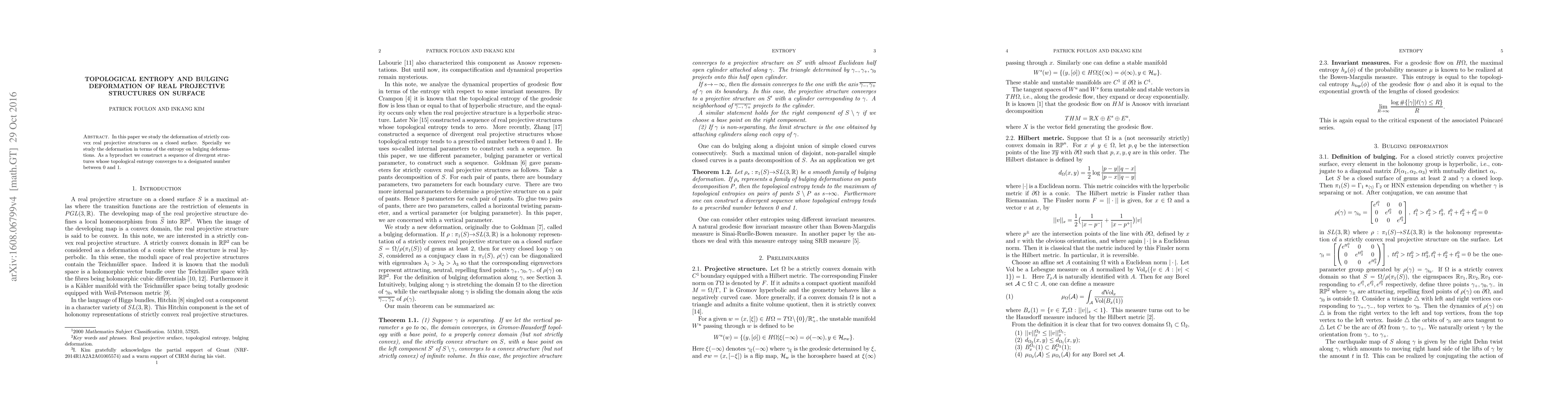 This paper investigates the deformation of strictly convex real projective structures on closed surfaces, focusing on entropy in bulging deformations. It constructs a sequence of divergent structures with topological entropy converging to a number between 0 and 1.