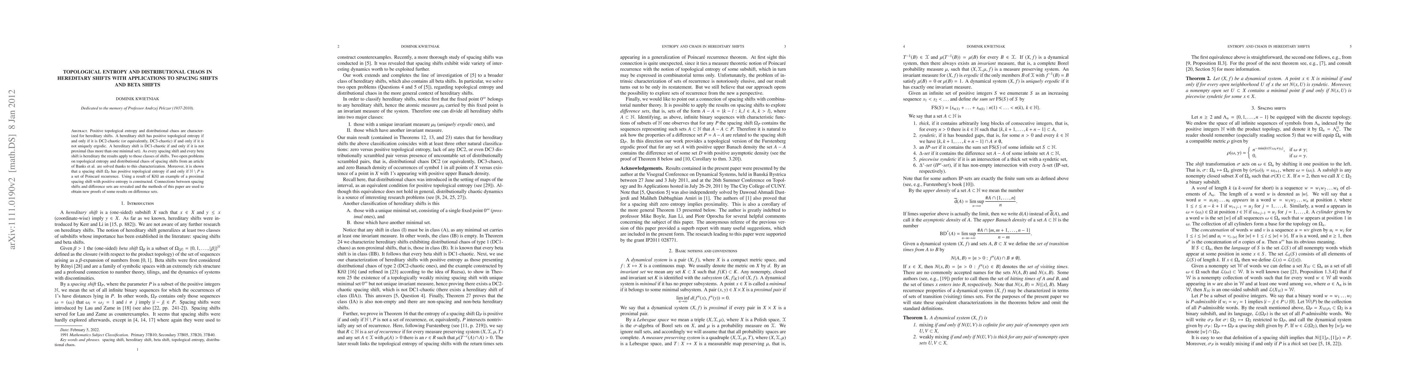 This paper characterizes positive topological entropy and distributional chaos in hereditary shifts, showing that they are equivalent to non-unique ergodicity and specific chaos levels. It applies these results to spacing shifts and beta shifts, solving open problems on topological entropy for spacing shifts and revealing connections between them and difference sets.