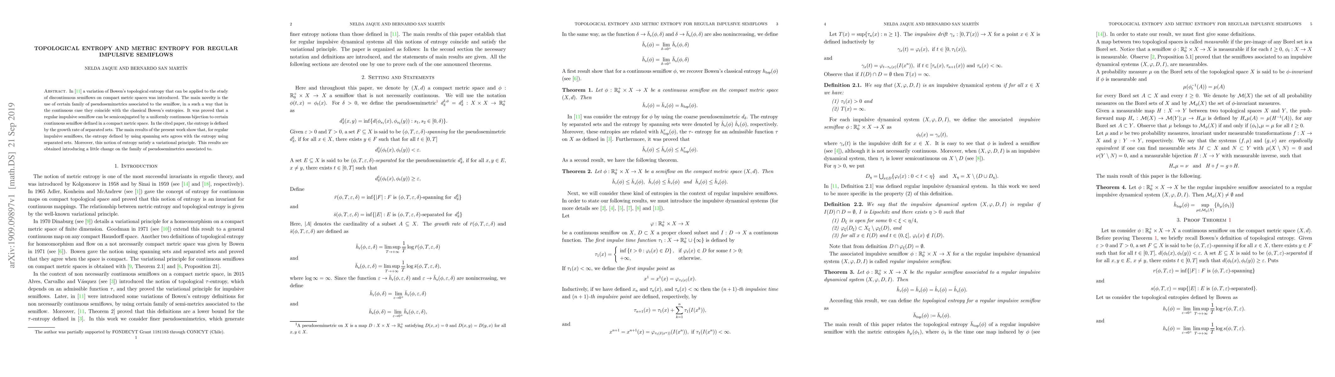 In arXiv:1801.01238 a variation of Bowen's topological entropy that can be applied to the study of discontinuous semiflows on compact metric spaces was introduced. The main novetly is the use of certain family of pseudosemimetrics associated to the semiflow, in a such a way that in the continuous case they coincide with the classical Bowen's entropies. It was proved that regular impulsive semiflow can be semiconjugated by uniformly continuous bijection to certain continuous semiflow defined in a compact metric space. In the cited paper, the entropy is defined by the growth rate of separated sets. The main results of the present work is show that, for regular impulsive semiflows, the entropy defined by using spanning sets agrees with the entropy using separated sets. Moreover, this notion of entropy satisfy a variational principle. This results are obtained introducing a little change on the family of pseudosemimetrics associated to.