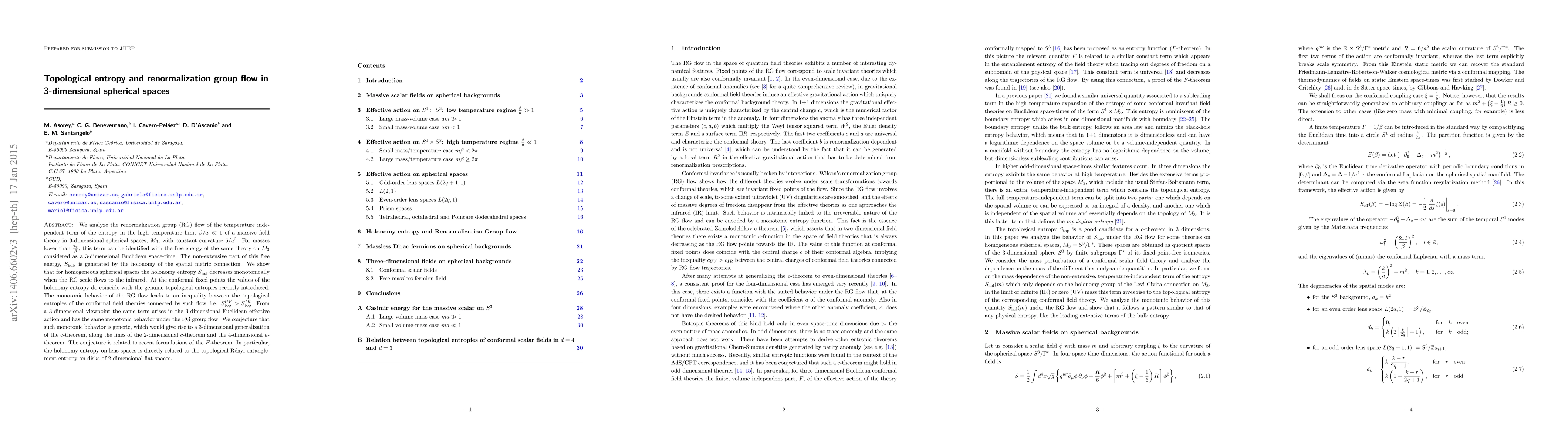 We analyze the renormalization group (RG) flow of the temperature independent term of the entropy in the high temperature limit \beta/a<<1 of a massive field theory in 3-dimensional spherical spaces M_3 with constant curvature 6/a^2. For masses lower than 2\pi/\beta, this term can be identified with the free energy of the same theory on M_3 considered as a 3-dimensional Euclidean space-time. The non-extensive part of this free energy, S_hol, is generated by the holonomy of the spatial metric connection. We show that for homogeneous spherical spaces the holonomy entropy S_hol decreases monotonically when the RG scale flows to the infrared. At the conformal fixed points the values of the holonomy entropy do coincide with the genuine topological entropies recently introduced. The monotonic behavior of the RG flow leads to an inequality between the topological entropies of the conformal field theories connected by such flow, i.e. S_top^UV > S_top^IR. From a 3-dimensional viewpoint the same term arises in the 3-dimensional Euclidean effective action and has the same monotonic behavior under the RG group flow. We conjecture that such monotonic behavior is generic, which would give rise to a 3-dimensional generalization of the c-theorem, along the lines of the 2-dimensional c-theorem and the 4-dimensional a-theorem. The conjecture is related to recent formulations of the F-theorem. In particular, the holonomy entropy on lens spaces is directly related to the topological R\'enyi entanglement entropy on disks of 2-dimensional flat spaces.