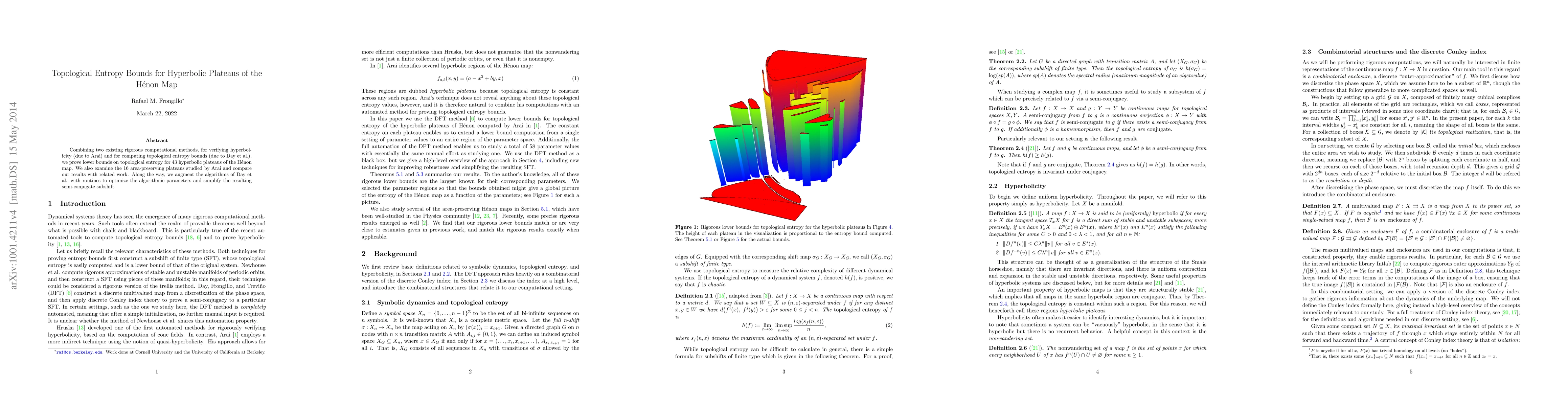 Combining two existing rigorous computational methods, for verifying hyperbolicity (due to Arai) and for computing topological entropy bounds (due to Day et al.), we prove lower bounds on topological entropy for 43 hyperbolic plateaus of the H\'enon map. We also examine the 16 area-preserving plateaus studied by Arai and compare our results with related work. Along the way, we augment the algorithms of Day et al. with routines to optimize the algorithmic parameters and simplify the resulting semi-conjugate subshift.