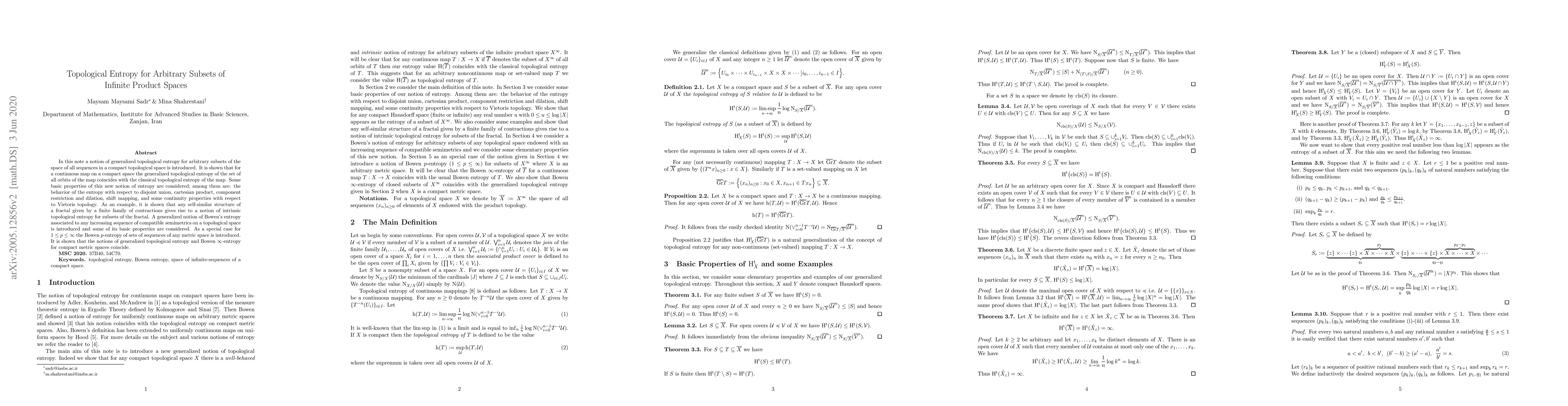 In this note a notion of generalized topological entropy for arbitrary subsets of the space of all sequences in a compact topological space is introduced. It is shown that for a continuous map on a compact space the generalized topological entropy of the set of all orbits of the map coincides with the classical topological entropy of the map. Some basic properties of this new notion of entropy are considered; among them are: the behavior of the entropy with respect to disjoint union, cartesian product, component restriction and dilation, shift mapping, and some continuity properties with respect to Vietoris topology. As an example, it is shown that any self-similar structure of a fractal given by a finite family of contractions gives rise to a notion of intrinsic topological entropy for subsets of the fractal. A generalized notion of Bowen's entropy associated to any increasing sequence of compatible semimetrics on a topological space is introduced and some of its basic properties are considered. As a special case for $1\leq p\leq\infty$ the Bowen $p$-entropy of sets of sequences of any metric space is introduced. It is shown that the notions of generalized topological entropy and Bowen $\infty$-entropy for compact metric spaces coincide.