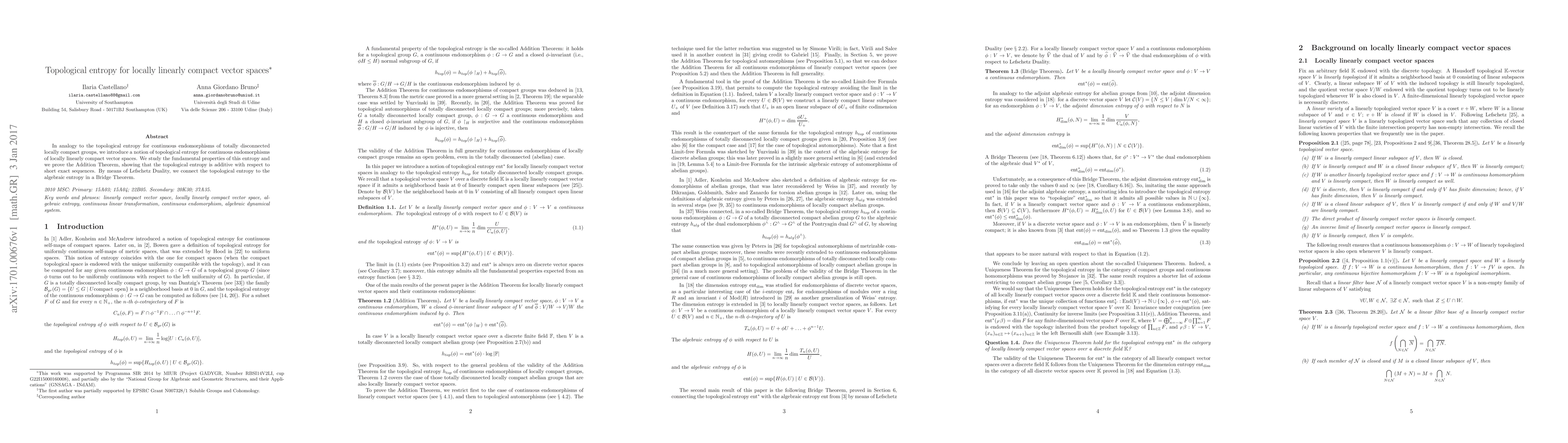 This paper introduces topological entropy for continuous endomorphisms of locally linearly compact vector spaces, studying its properties and proving the Addition Theorem. It establishes a connection between topological and algebraic entropy via Lefschetz Duality.