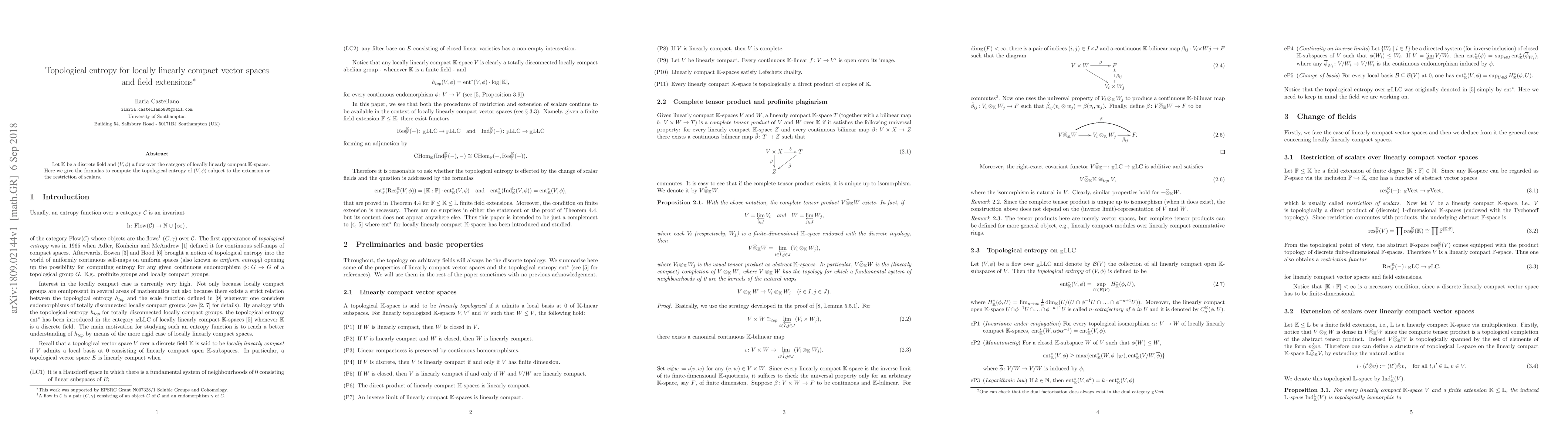 This paper provides formulas for calculating the topological entropy of flows over locally linearly compact vector spaces, specifically when scalars are extended or restricted within the context of a discrete field $\mathbb{K}$. The focus is on the impact of these scalar changes on the topological entropy.