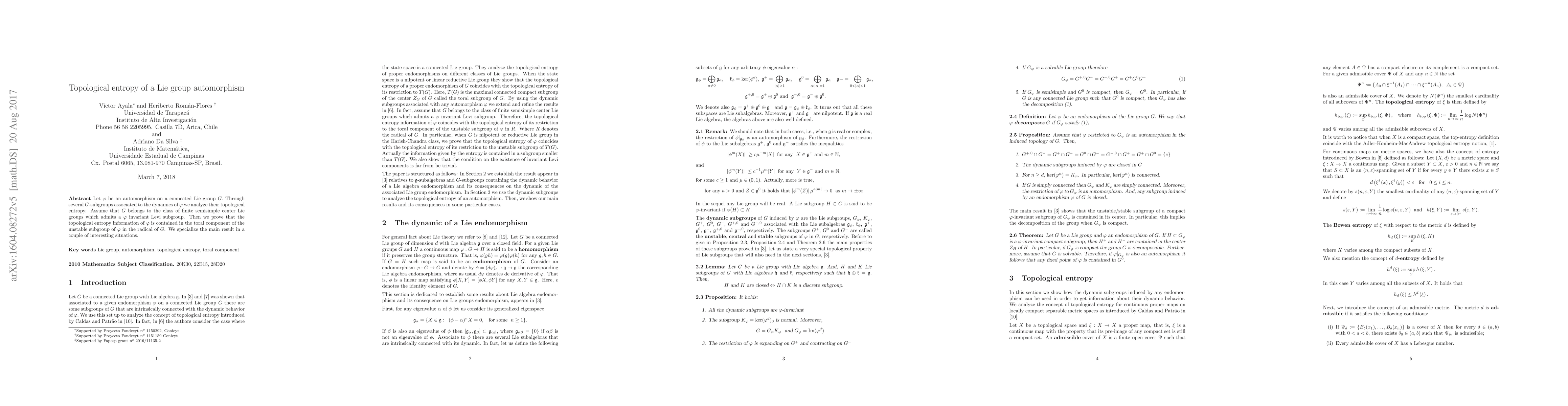 Let {\phi} be an automorphism on a connected Lie group G. Through several G-subgroups associated to the dynamics of {\phi} we analyze their topological entropy. Assume that G belongs to the class of finite semisimple center Lie groups which admits a {\phi} invariant Levi subgroup. Then we prove that the topological entropy information of {\phi} is contained in the toral component of the unstable subgroup of {\phi} in the radical of G. We specialize the main result in a couple of interesting situations.