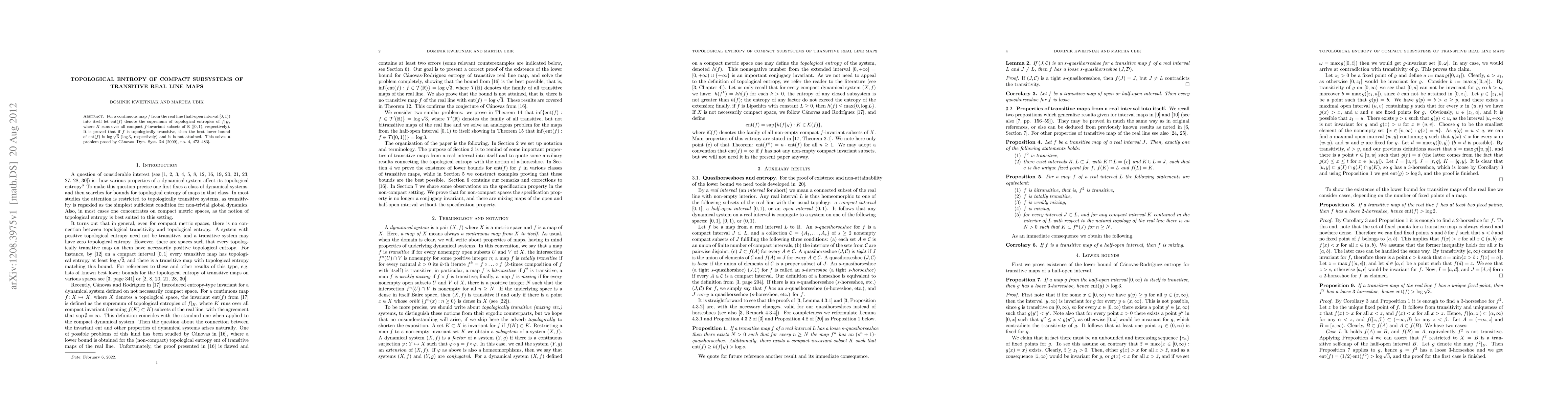 For a continuous map $f$ from the real line (half-open interval $[0,1)$) into itself let ent(f) denote the supremum of topological entropies of $f|_K$, where $K$ runs over all compact $f$-invariant subsets of $\mathbb{R}$ ($[0,1)$, respectively). It is proved that if $f$ is topologically transitive, then the best lower bound of ent(f) is $\log\sqrt{3}$ ($\log 3$, respectively) and it is not attained. This solves a problem posed by C{\'a}novas [Dyn. Syst. \textbf{24} (2009), no. 4, 473--483].