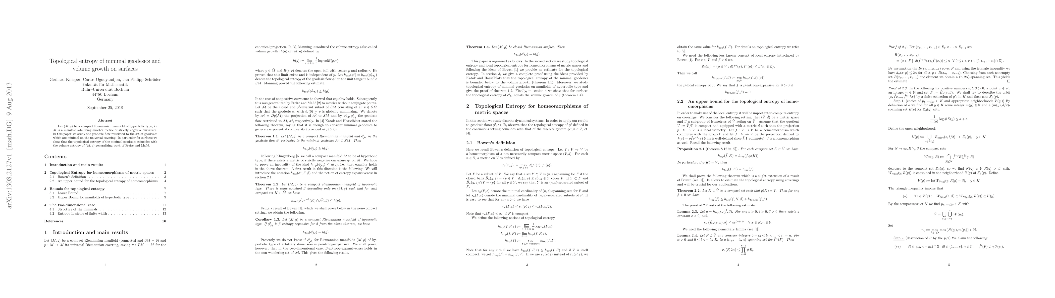 This paper investigates the geodesic flow on hyperbolic surfaces, focusing on minimal geodesics. It demonstrates that the topological entropy of these minimal geodesics equals the volume entropy of the surface, extending previous results by Freire and Mane.