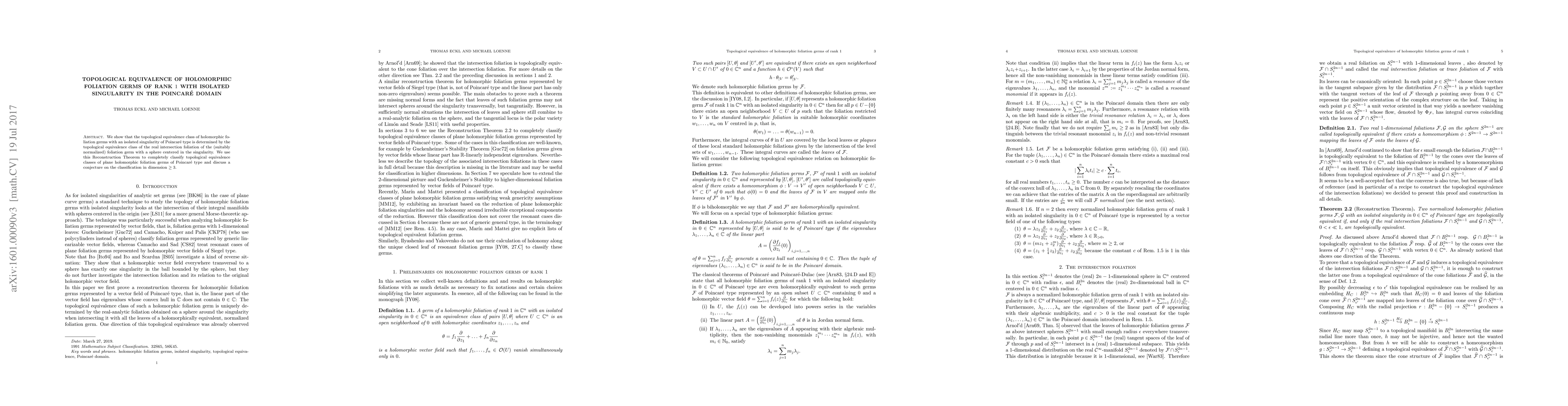 This paper demonstrates that the topological equivalence of rank 1 holomorphic foliation germs with an isolated singularity of Poincaré type is determined by the real intersection foliation with a sphere centered at the singularity. It uses this insight to classify plane foliation germs and discusses a conjecture for higher dimensions.