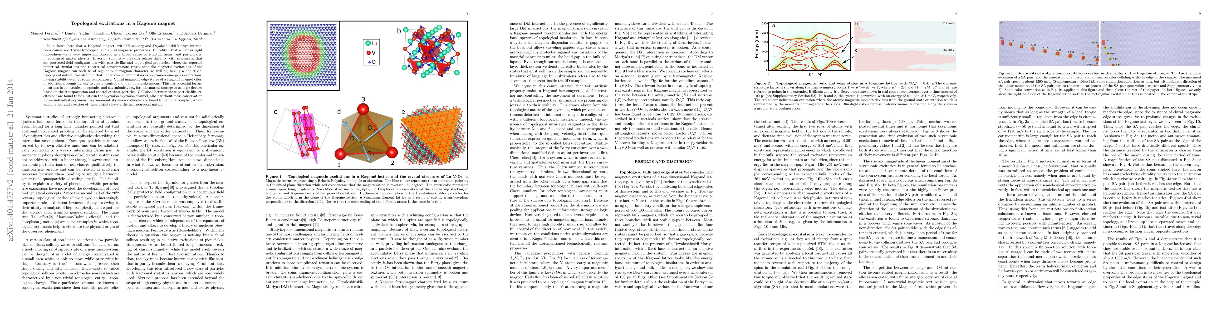This paper investigates the topological and chiral magnetic properties of a Kagom\'e magnet, revealing that it exhibits both regular bulk magnons and non-trivial topological excitations, including skyrmions. These findings suggest potential applications in spintronics and magnonics, with implications for information storage and logic devices based on skyrmion manipulation.