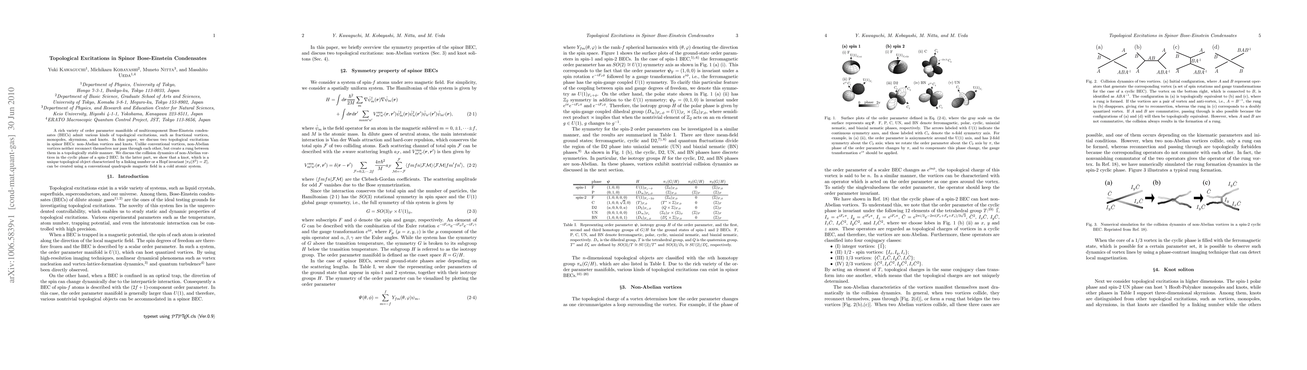 This paper explores topological excitations in spinor Bose-Einstein condensates, focusing on non-Abelian vortices and knots. It details the unique collision dynamics of non-Abelian vortices and demonstrates the creation of knots using a quadrupole magnetic field in a cold atomic system.