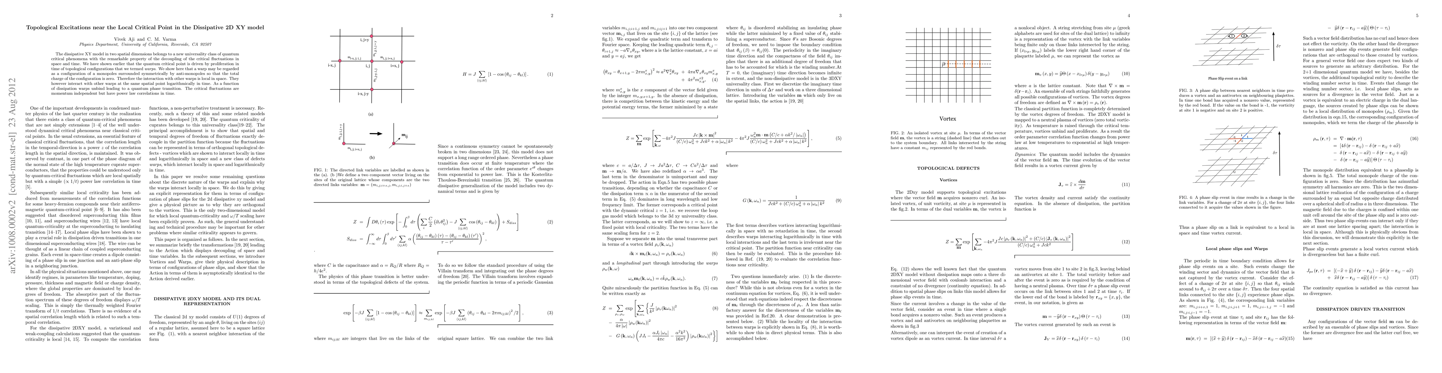 The dissipative XY model in two spatial dimensions belongs to a new universality class of quantum critical phenomena with the remarkable property of the decoupling of the critical fluctuations in space and time. We have shown earlier that the quantum critical point is driven by proliferation in time of topological configurations that we termed warps. We show here that a warp may be regarded as a configuration of a monopoles surrounded symmetrically by anti-monopoles so that the total charge of the configuration is zero. Therefore the interaction with other warps is local in space. They however interact with other warps at the same spatial point logarithmically in time. As a function of dissipation warps unbind leading to a quantum phase transition. The critical fluctuations are momentum independent but have power law correlations in time.