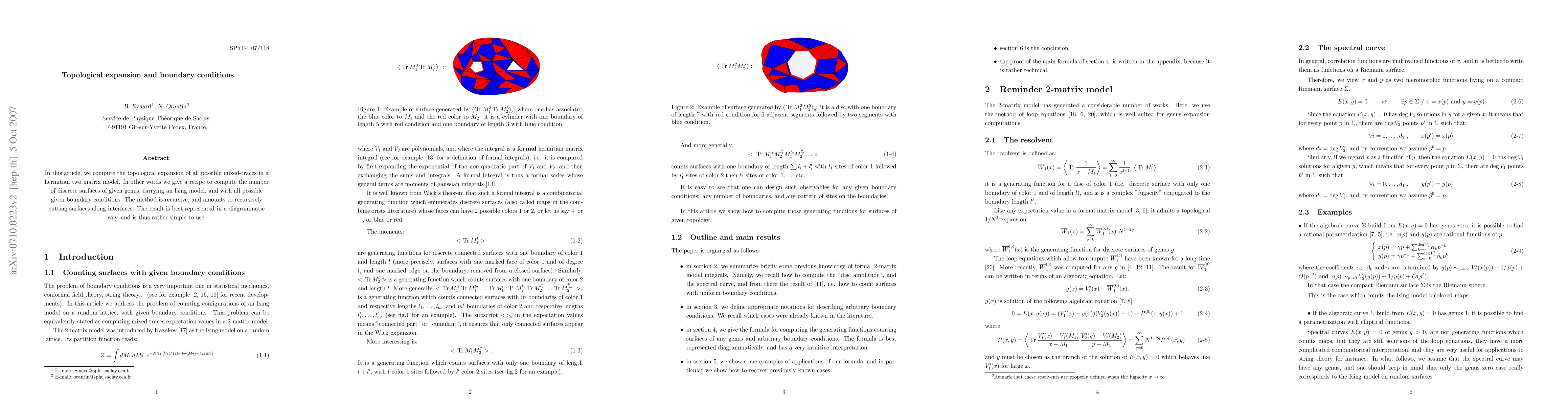 In this article, we compute the topological expansion of all possible mixed-traces in a hermitian two matrix model. In other words we give a recipe to compute the number of discrete surfaces of given genus, carrying an Ising model, and with all possible given boundary conditions. The method is recursive, and amounts to recursively cutting surfaces along interfaces. The result is best represented in a diagrammatic way, and is thus rather simple to use.