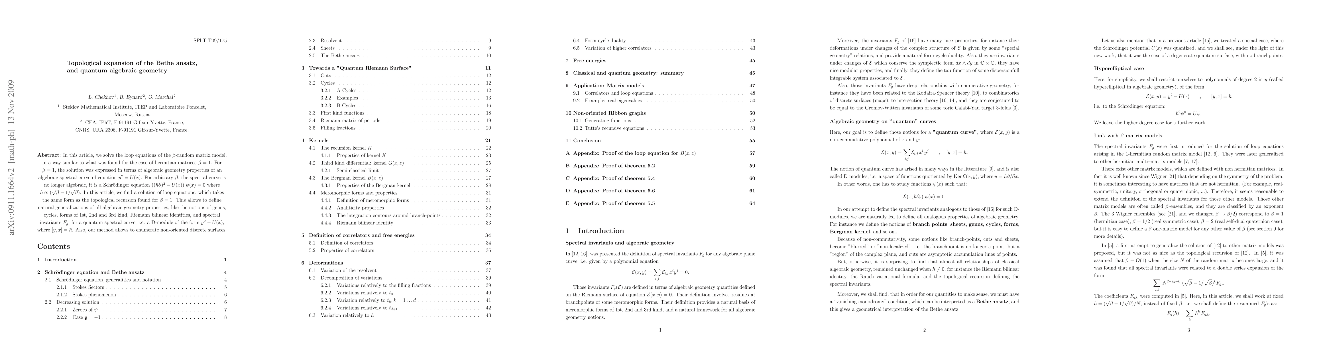In this article, we solve the loop equations of the \beta-random matrix model, in a way similar to what was found for the case of hermitian matrices \beta=1. For \beta=1, the solution was expressed in terms of algebraic geometry properties of an algebraic spectral curve of equation y^2=U(x). For arbitrary \beta, the spectral curve is no longer algebraic, it is a Schroedinger equation ((\hbar\partial)^2-U(x)).\psi(x)=0 where \hbar\propto (\sqrt\beta-1/\sqrt\beta). In this article, we find a solution of loop equations, which takes the same form as the topological recursion found for \beta=1. This allows to define natural generalizations of all algebraic geometry properties, like the notions of genus, cycles, forms of 1st, 2nd and 3rd kind, Riemann bilinear identities, and spectral invariants F_g, for a quantum spectral curve, i.e. a D-module of the form y^2-U(x), where [y,x]=\hbar. Also, our method allows to enumerate non-oriented discrete surfaces.