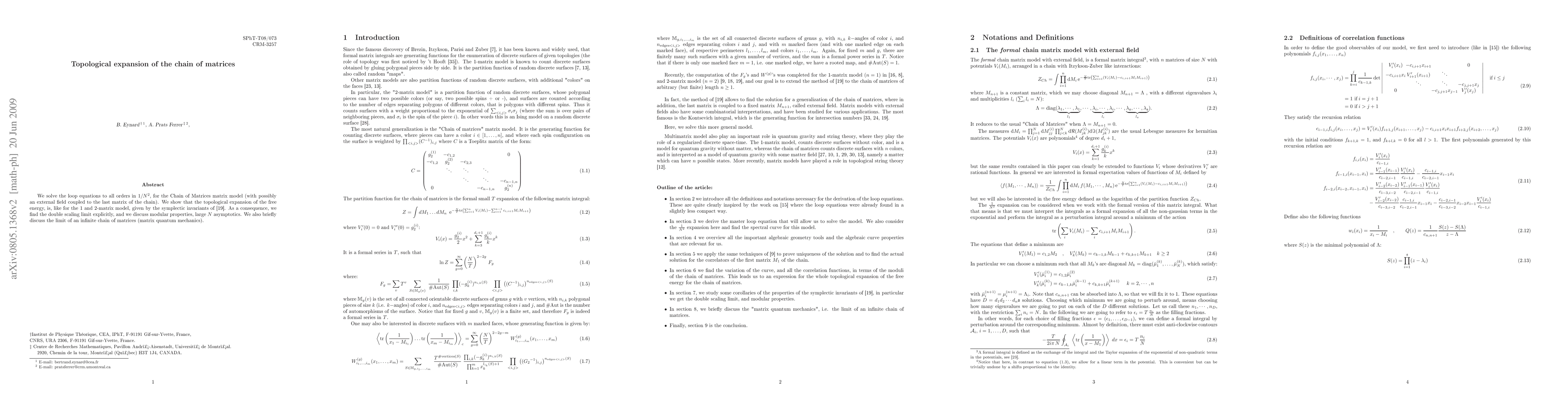 We solve the loop equations to all orders in $1/N^2$, for the Chain of Matrices matrix model (with possibly an external field coupled to the last matrix of the chain). We show that the topological expansion of the free energy, is, like for the 1 and 2-matrix model, given by the symplectic invariants of the associated spectral curve. As a consequence, we find the double scaling limit explicitly, and we discuss modular properties, large $N$ asymptotics. We also briefly discuss the limit of an infinite chain of matrices (matrix quantum mechanics).