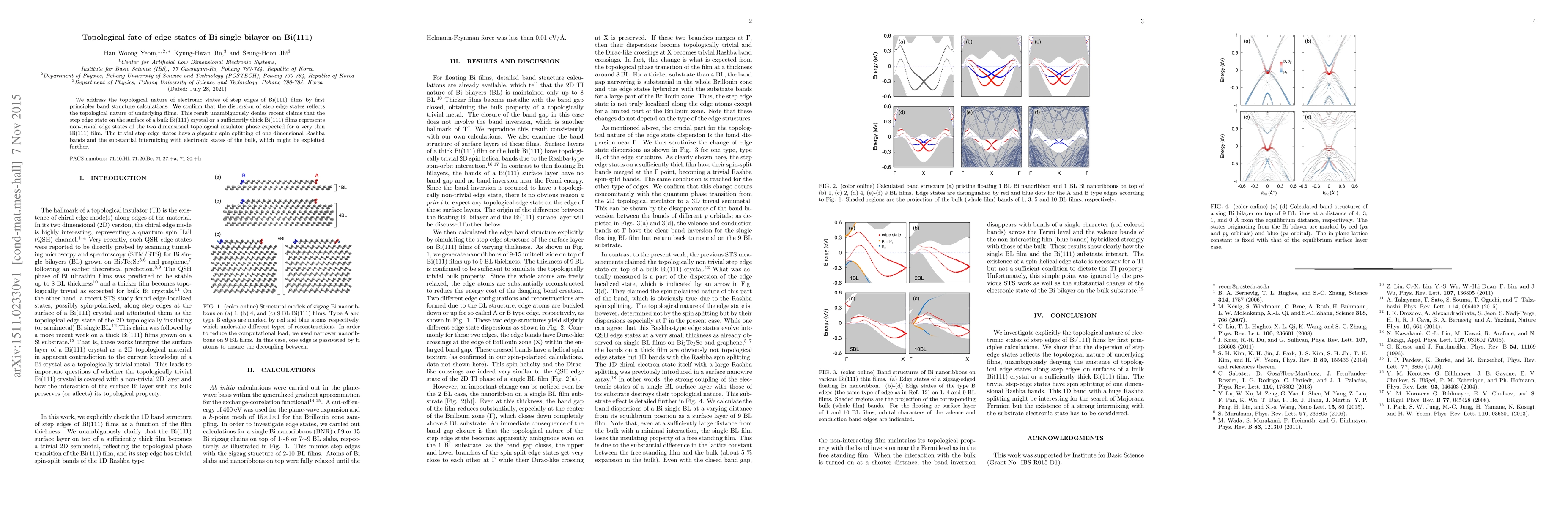 This paper confirms that the electronic states at the step edges of Bi(111) films reflect the topological nature of the underlying films, refuting claims of non-trivial edge states in thicker films. The step edge states exhibit a large spin splitting and significant mixing with bulk states.