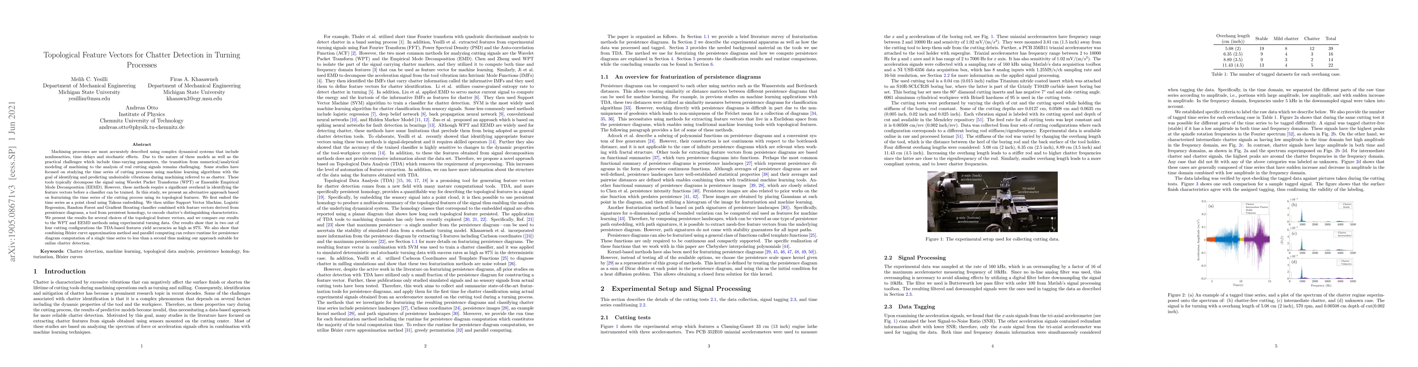 Machining processes are most accurately described using complex dynamical systems that include nonlinearities, time delays, and stochastic effects. Due to the nature of these models as well as the practical challenges which include time-varying parameters, the transition from numerical/analytical modeling of machining to the analysis of real cutting signals remains challenging. Some studies have focused on studying the time series of cutting processes using machine learning algorithms with the goal of identifying and predicting undesirable vibrations during machining referred to as chatter. These tools typically decompose the signal using Wavelet Packet Transforms (WPT) or Ensemble Empirical Mode Decomposition (EEMD). However, these methods require a significant overhead in identifying the feature vectors before a classifier can be trained. In this study, we present an alternative approach based on featurizing the time series of the cutting process using its topological features. We first embed the time series as a point cloud using Takens embedding. We then utilize Support Vector Machine, Logistic Regression, Random Forest and Gradient Boosting classifier combined with feature vectors derived from persistence diagrams, a tool from persistent homology, to encode chatter's distinguishing characteristics. We present the results for several choices of the topological feature vectors, and we compare our results to the WPT and EEMD methods using experimental turning data. Our results show that in two out of four cutting configurations the TDA-based features yield accuracies as high as 97%. We also show that combining Bezier curve approximation method and parallel computing can reduce runtime for persistence diagram computation of a single time series to less than a second thus making our approach suitable for online chatter detection.