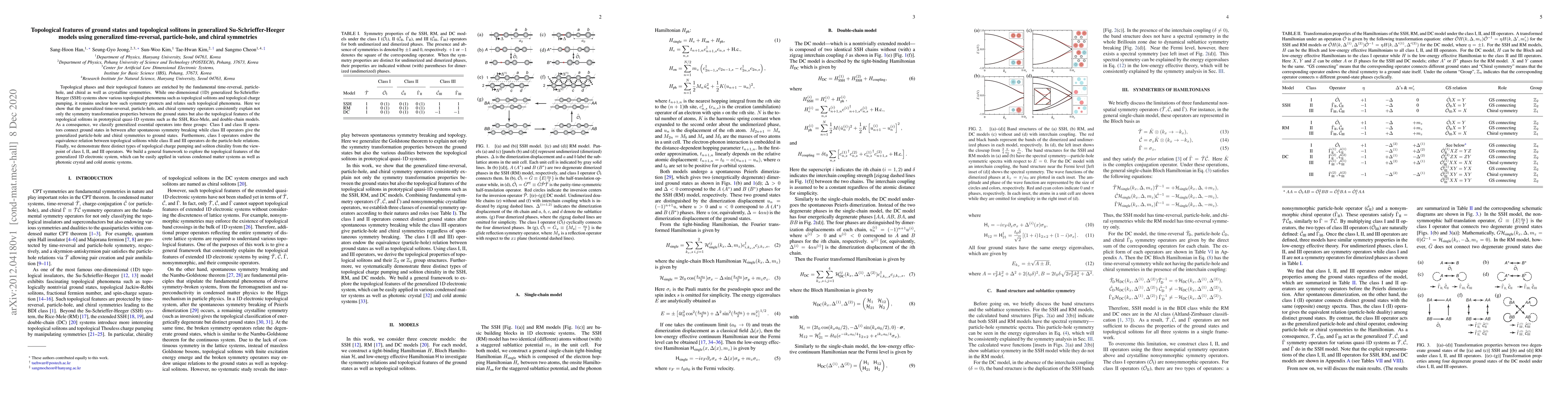 Topological phases and their topological features are enriched by the fundamental time-reversal, particle-hole, and chiral as well as crystalline symmetries. While one-dimensional (1D) generalized Su-Schrieffer-Heeger (SSH) systems show various topological phenomena such as topological solitons and topological charge pumping, it remains unclear how such symmetry protects and relates such topological phenomena. Here we show that the generalized time-reversal, particle-hole, and chiral symmetry operators consistently explain not only the symmetry transformation properties between the ground states but also the topological features of the topological solitons in prototypical quasi-1D systems such as the SSH, Rice-Mele, and double-chain models. As a consequence, we classify generalized essential operators into three groups: Class I and class II operators connect ground states in between after spontaneous symmetry breaking while class III operators give the generalized particle-hole and chiral symmetries to ground states. Furthermore, class I operators endow the equivalence relation between topological solitons while class II and III operators do the particle-hole relations. Finally, we demonstrate three distinct types of topological charge pumping and soliton chirality from the viewpoint of class I, II, and III operators. We build a general framework to explore the topological features of the generalized 1D electronic system, which can be easily applied in various condensed matter systems as well as photonic crystal and cold atomic systems.