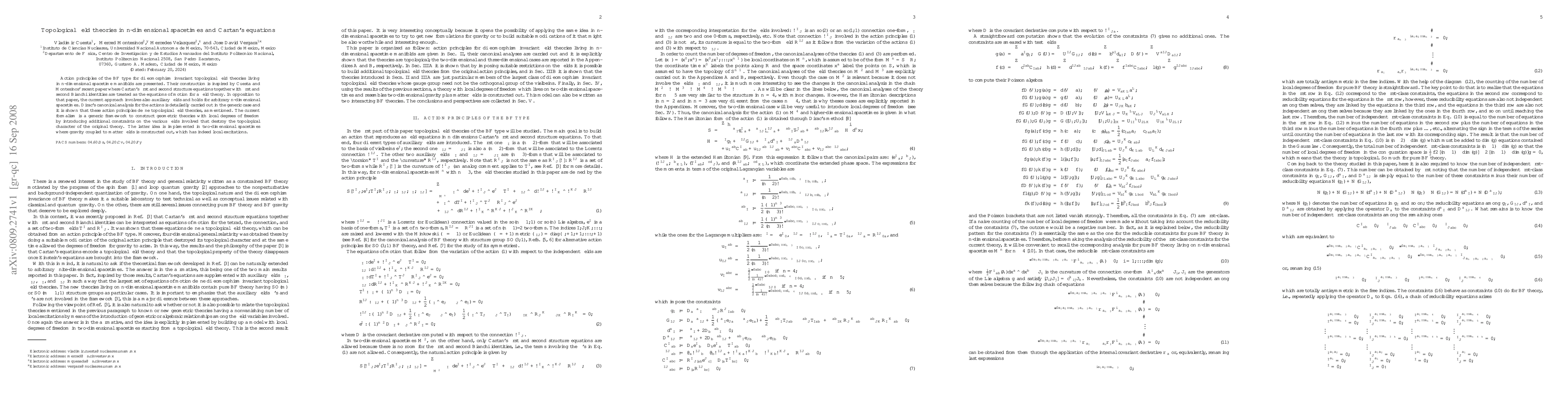 Action principles of the BF type for diffeomorphism invariant topological field theories living in n-dimensional spacetime manifolds are presented. Their construction is inspired by Cuesta and Montesinos' recent paper where Cartan's first and second structure equations together with first and second Bianchi identities are treated as the equations of motion for a field theory. In opposition to that paper, the current approach involves also auxiliary fields and holds for arbitrary n-dimensional spacetimes. Dirac's canonical analysis for the actions is detailedly carried out in the generic case and it is shown that these action principles define topological field theories, as mentioned. The current formalism is a generic framework to construct geometric theories with local degrees of freedom by introducing additional constraints on the various fields involved that destroy the topological character of the original theory. The latter idea is implemented in two-dimensional spacetimes where gravity coupled to matter fields is constructed out, which has indeed local excitations.