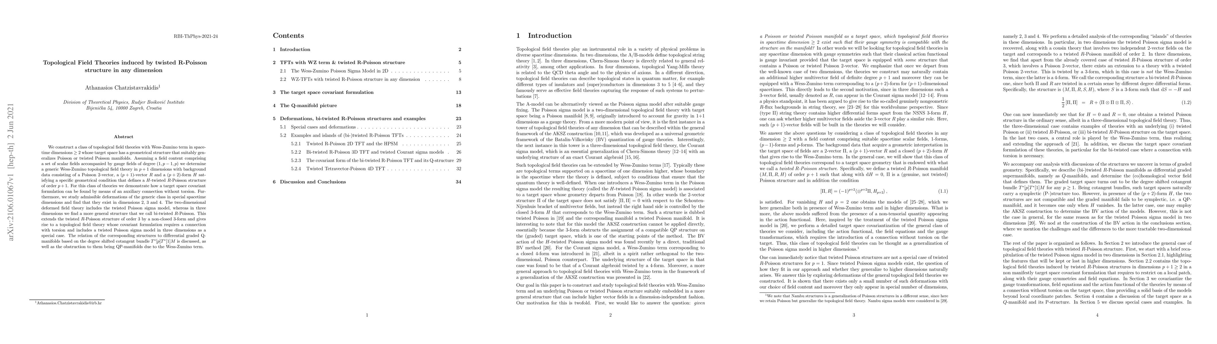 This paper constructs topological field theories in dimensions ≥2 using a twisted R-Poisson structure and demonstrates a target space covariant formulation. It identifies admissible deformations in dimensions 2-4, highlighting the twisted Poisson sigma model in 2D and a bi-twisted R-Poisson structure in 3D.