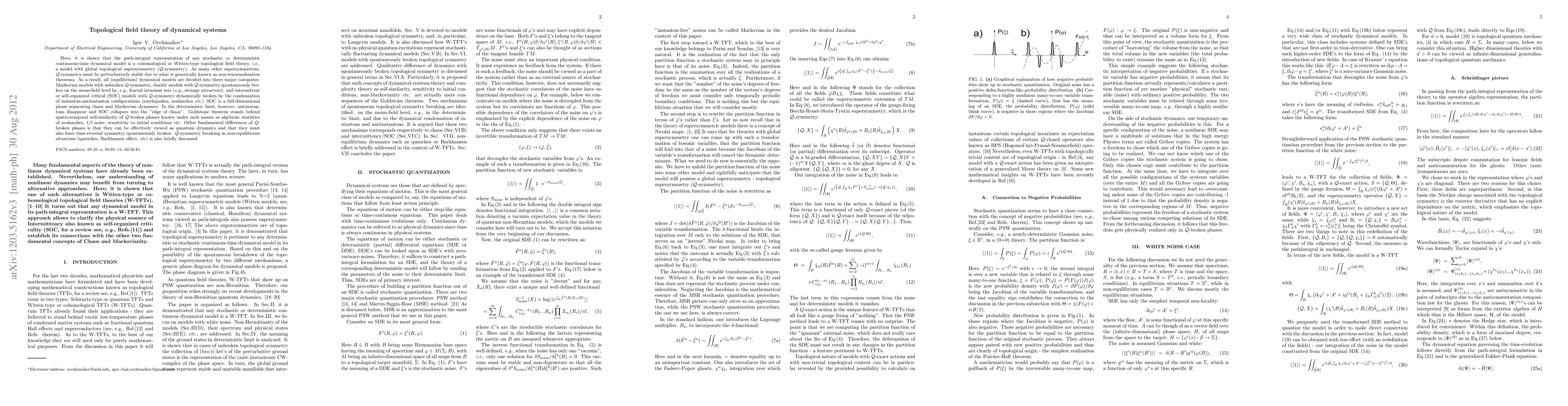 This research demonstrates that dynamical models, whether stochastic or deterministic, can be described as topological field theories with global topological supersymmetry (Q-symmetry). It categorizes models into Markovian, chaotic, and intermittent/SOC types based on Q-symmetry, which is either unbroken, spontaneously broken by fractal sets, or dynamically broken by instanton-antiinstanton condensation. The study also highlights that Q-symmetry breaking leads to quantum-like dynamics, spontaneous time-reversal symmetry breaking, and self-similarity observed in chaotic systems.