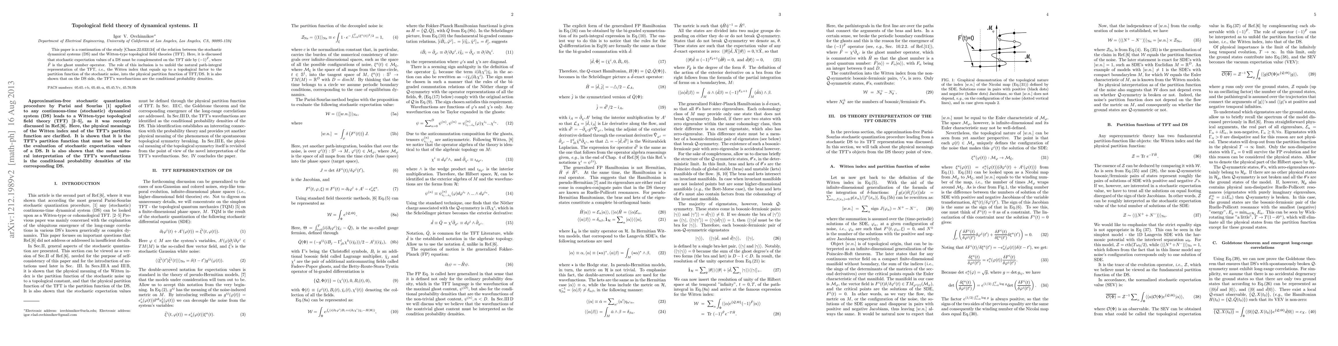 This paper is a continuation of the study [Chaos.22.033134] of the relation between the stochastic dynamical systems (DS) and the Witten-type topological field theories (TFT). Here, it is discussed that stochastic expectation values of a DS must be complemented on the TFT side by $(-1)^{\hat F}$, where $\hat F$ is the ghost number operator. The role of this inclusion is to unfold the natural path-integral representation of the TFT, \emph{i.e.}, the Witten index that equals up to a topological factor to the partition function of the stochastic noise, into the physical partition function of TFT/DS. It is also shown that on the DS side, the TFT's wavefunctions are the conditional probability densities.