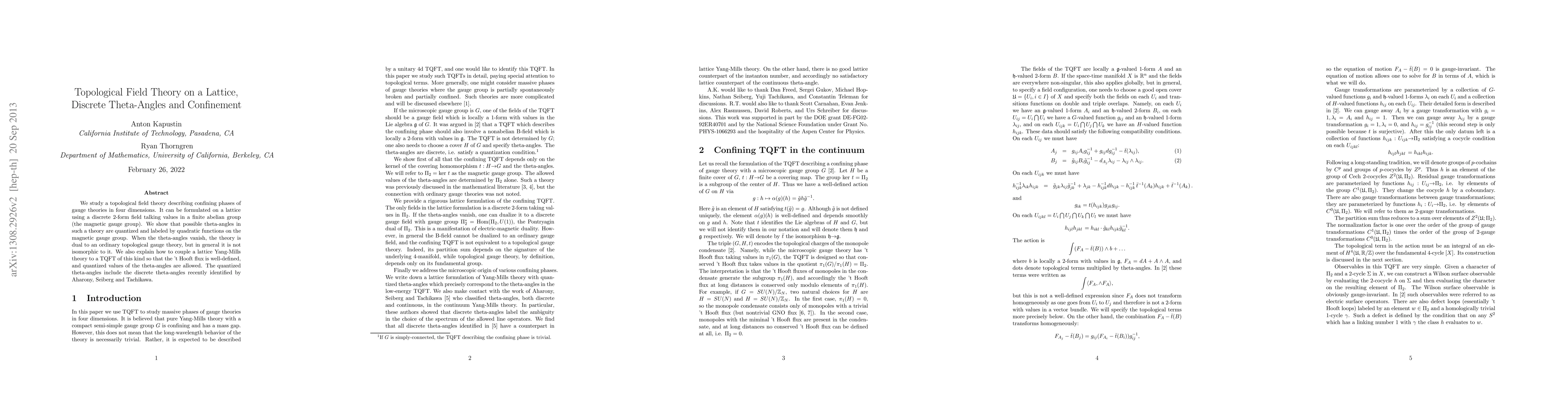 This research explores a topological field theory on a lattice that describes the confining phases of four-dimensional gauge theories. It demonstrates that the possible theta-angles are quantized and labeled by quadratic functions on the magnetic gauge group, and it discusses the coupling of lattice Yang-Mills theory to this topological field theory to allow for well-defined 't Hooft flux and quantized theta-angles.