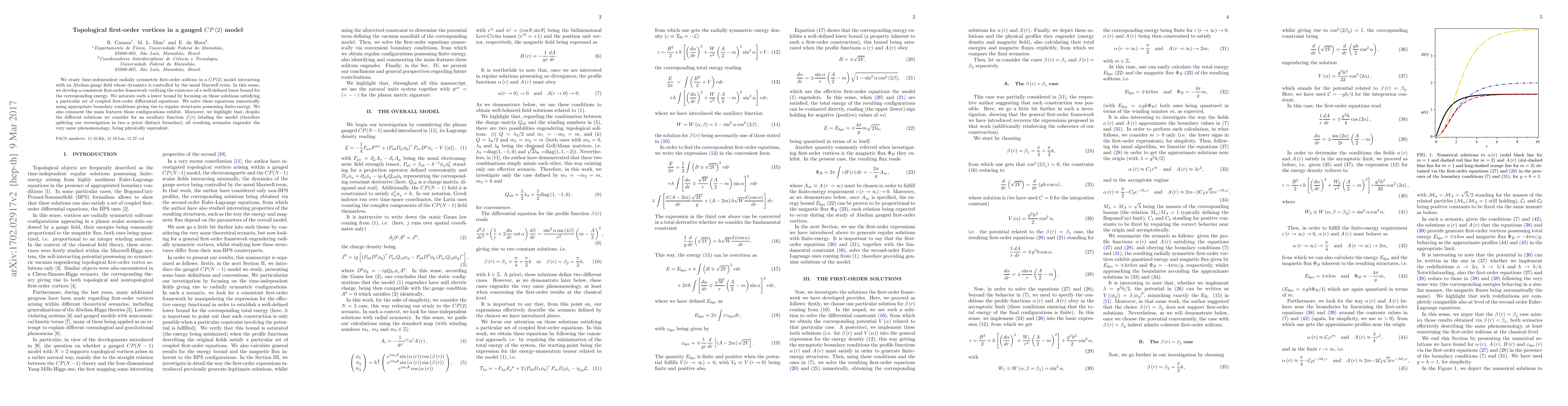 We study time-independent radially symmetric first-order solitons in a CP(2) model interacting with an Abelian gauge field whose dynamics is controlled by the usual Maxwell term. In this sense, we develop a consistent first-order framework verifying the existence of a well-defined lower bound for the corresponding energy. We saturate such a lower bound by focusing on those solutions satisfying a particular set of coupled first-order differential equations. We solve these equations numerically using appropriate boundary conditions giving rise to regular structures possessing finite-energy. We also comment the main features these configurations exhibit. Moreover, we highlight that, despite the different solutions we consider for an auxiliary function $\beta \left( r\right) $ labeling the model (therefore splitting our investigation in two a priori distinct branches), all resulting scenarios engender the very same phenomenology, being physically equivalent.