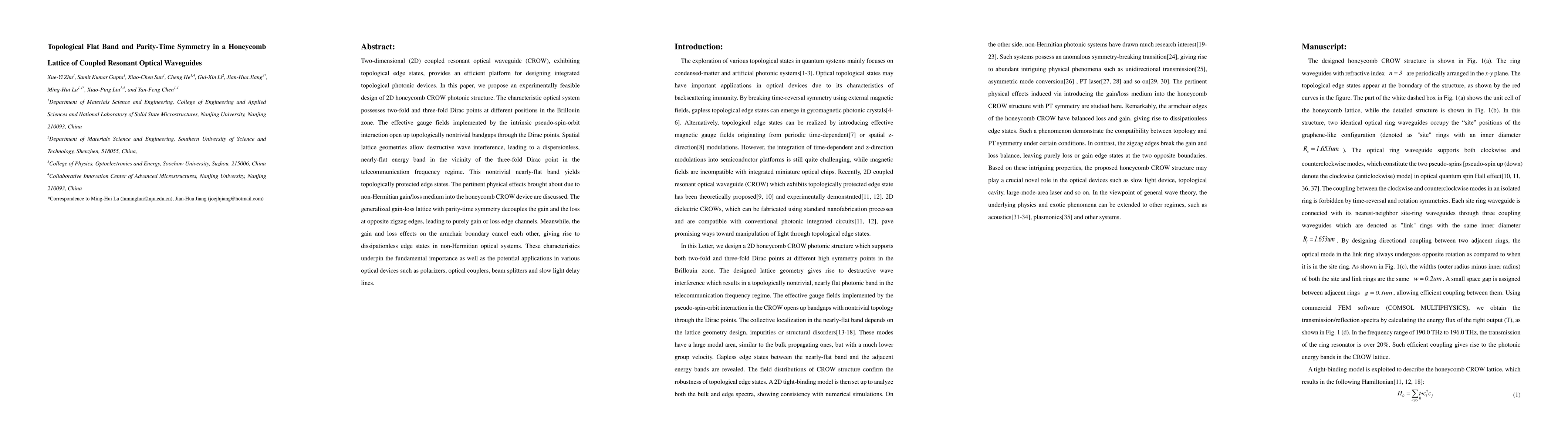 This paper proposes a 2D honeycomb lattice of coupled resonant optical waveguides (CROW) with topological flat bands and parity-time symmetry. The design features topologically protected edge states and nearly-flat bands in the telecommunication frequency regime, enabling potential applications in integrated photonic devices like polarizers and beam splitters.