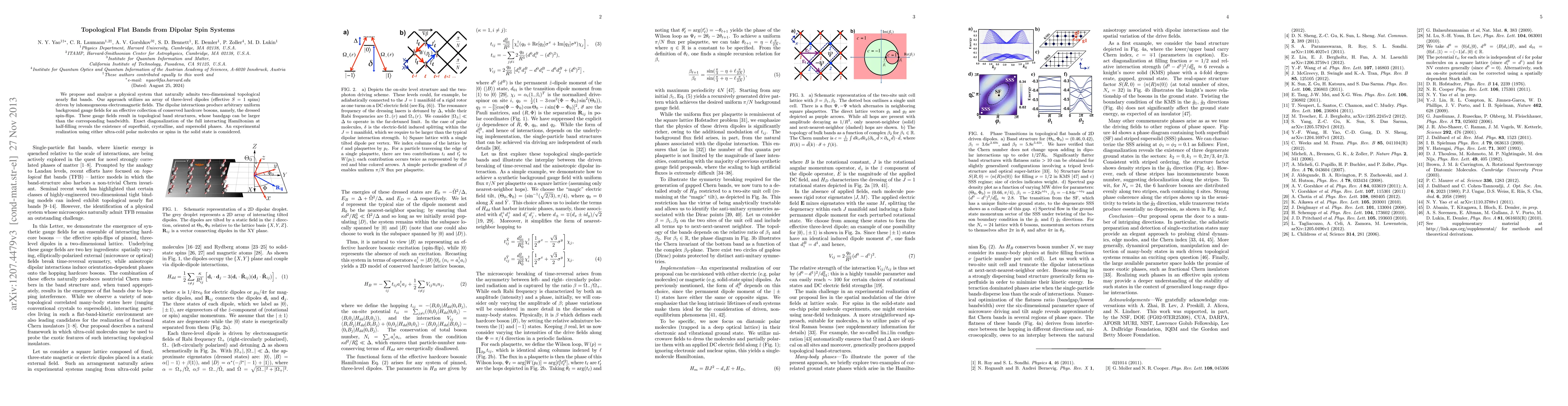 We propose and analyze a physical system that naturally admits two-dimensional topological nearly flat bands. Our approach utilizes an array of three-level dipoles (effective S = 1 spins) driven by inhomogeneous electromagnetic fields. The dipolar interactions produce arbitrary uniform background gauge fields for an effective collection of conserved hardcore bosons, namely, the dressed spin-flips. These gauge fields result in topological band structures, whose bandgap can be larger than the corresponding bandwidth. Exact diagonalization of the full interacting Hamiltonian at half-filling reveals the existence of superfluid, crystalline, and supersolid phases. An experimental realization using either ultra-cold polar molecules or spins in the solid state is considered.
